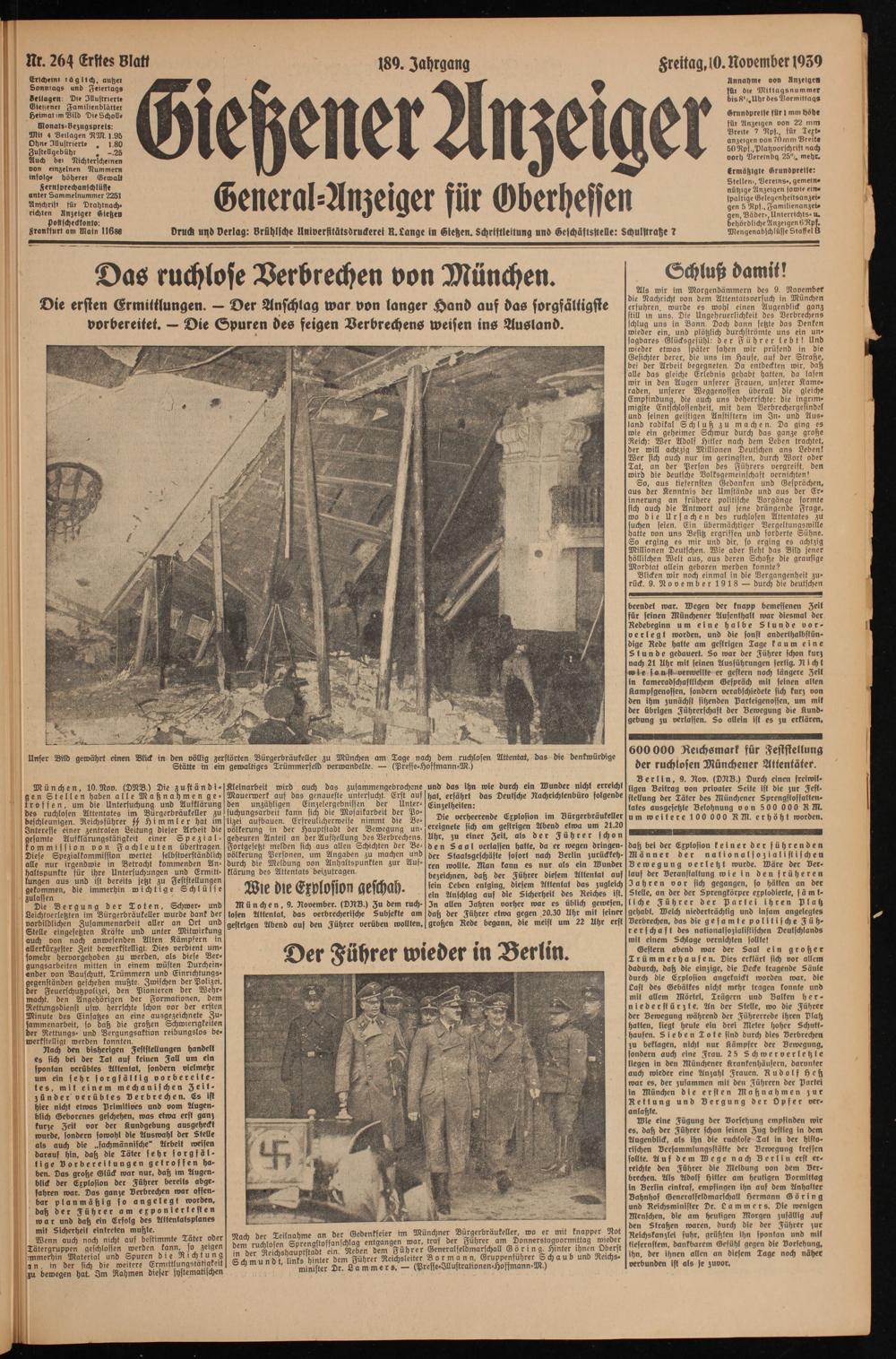 Die verheerende Explosion im Bürgerbräukeller ereignete sich am gestrigen Abend etwa um 21.20 Uhr, zu einer Zeit, als der Führer schon den Sagt verlassen hatte, da er wegen dringender Staatsgeschäfte sofort nach Berlin zurückkehren wollte. Man kann es nur als ein Wunder bezeichnen, daß der Führer diesem Attentat auf sein Leben entging, diesem Attentat das zugleich ein Anschlag auf die Sicherheit des Reiches ist. 3n allen Jahren vorher war es üblich gewesen, daß der Führer etwa gegen 20.30 Uhr mit seiner großen Rede begann, die meist um 22 Uhr erst