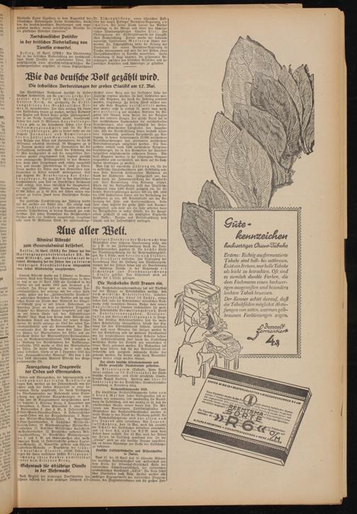 Im Statistischen Reichsamt herrscht in diesen Wochen Hochbetrieb, um die zweite große Inventur von Volk und Wirtschaft im Dritte n Reich, die gleichzeittg die Eröffnungsbilanz des Großdeutschen Reiches ist, vorzubereiten. Der Laie vermag sich kaum reine Vorstellung davon zu machen, welchen Aufwand von Papier und Arbeit dieses größte Zählunaswerk, das je im Reiche durchgeführt wurde, beansprucht. Neben den rund 25 Millionen Haushaltung s- listen gibt es die besonderen Listen für den 'Abstammungsnachweis und für die Betriebszählungen, gibt es ferner mehr als ein 'Dutzend Formulare und Anweisungen siürdieZählerund Gemeinden, insgesamt icine Aufgae von Listen und Formularen, die die 60 'Millionen erheblich übersteigt. 70 Waggons zu je 15 Tonnen werden allein an Formularen bei' der ^Volkszählung verbraucht. Wenn die Erhebung am 117. Mai durch geführt ist und die aus gefüllten Formulare wieder eingesammelt sind, beginnt zunächst seine umfangreiche Prüfungsarbeit in den Gemein- Len, denn jeder Fragebogen muß richttg ausgefüllt Jein, und manche Zweifelsfrage ist noch zu klären. Dann werden die Listen von den Gemeinden bzw. Wandräten in Kisten verpackt weitergeleitet. Erst Jetzt beginnt die Bearbeitung der Erhe- Lungsbogen, die zum Teil in den Statistischen Landesämtern, zum Teil im Statistischen Reichsamt selbst erfolgt, dem dann schließlich die 'Hauptarbeit, Die eigentliche Zählung und Auswertung obliegt. 12 000 Kisten zu je 80 Kilo mit Listen rollen insgesamt zu diesem Zweck beim Statistischen Reichs- nmt ein.