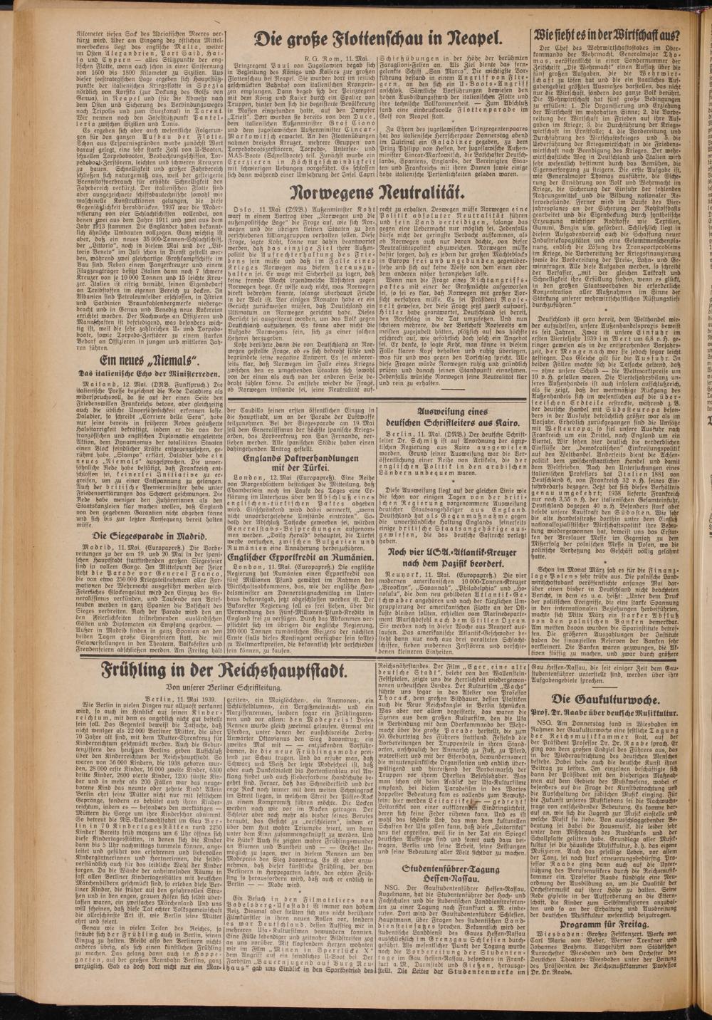der Caudillo seinen ersten öffentlichen Einzug in die Hauptstadt, um an der Parade der Luftwaffe teilzunehmen. Bei der Siegesparade am 19. Mai soll dem Generalissimus der höchste spanische Kriegs- ’orben, das Lorbeerkreuz von San Fernando, verliehen werden. Alle spanischen Städte haben einen dahingehenden Antrag gestellt.