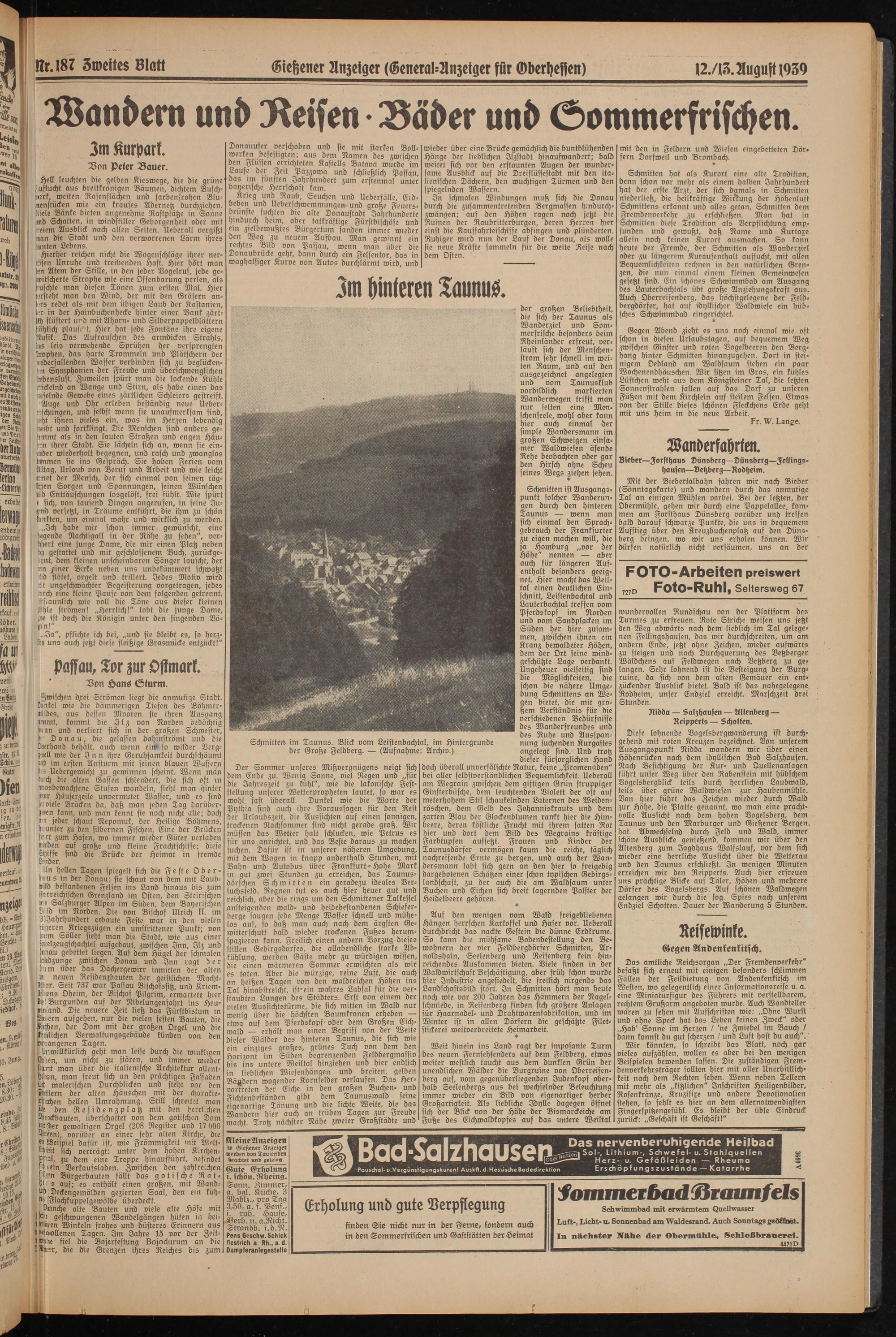 der großen Beliebtheit, die sich der Taunus als Wanderziel und Sommerfrische -besonders beim Rheinländer erfreut, verläuft sich der Menschenstrom sehr schnell im weiten Raum, und auf den ausgezeichnet angelegten und vom Taunusklub vorbildlich markierten Wanderwegen trifft man nur selten eine Men- schenseele, wohl aber kann hier auch einmal der simple Wandersmann im großen Schweigen einsamer Waldwiesen äsende Rehe beobachten oder gar den Hirsch ohne Scheu seines Wegs ziehen sehen.