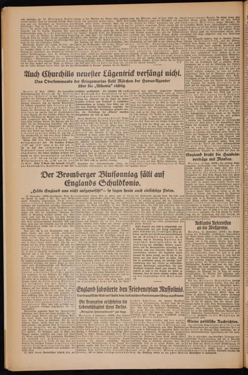 Und noch immer ist keine endgültige Ruhe in dieses schwergeprüfte Land eingekehrt, weil die von der polnischen Obrigkeit bis aufs äußerste verhetzten Menschen alles was deutsch ist als Freiwild erklärt und auf dieses Jagd gemacht hatten. Uebereinstim- mend siird die Deutschen der Ansicht, daß von ihnen keiner am Leben geblieben märe, wenn die deutschen Truppen auch nur zwei Tage später gekommen wären. Das Schlimmste spielte sich beim Abzug der polnischen Truppen ab in Gegenwart von Offizieren. Aber auch nach unserem Einzug noch mordeten polnische Soldaten, die sich Zivilkleidung besorgt hatten. Damit haben sie Die soldatische Ehre jenes polnischen Armeeteiles befleckt, der im Bromberger Gebiet eingesetzt war, wie auch der anständige Teil der Polen selbst noch betonte.