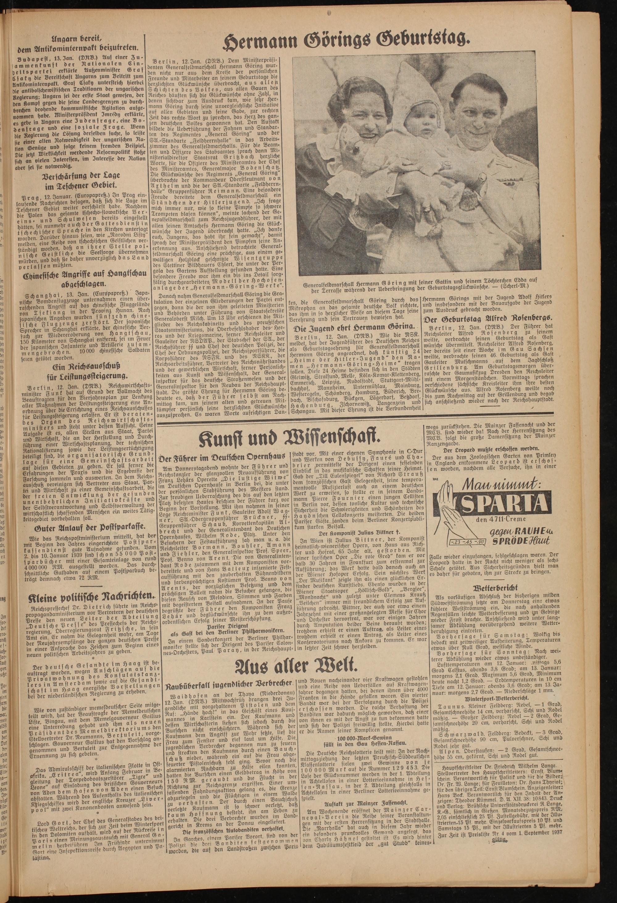 Hauptschriftleiter Dr. Friedrich Wilhelm Lange. Stellvertreter des Hauptschristleiters: Ernst B umschein. Verantwortlich für Politik und für die Bildes Dr Fr W. Lange; für Feuilleton: Dr. Hans Thynot; für den übrigenTeil:ErnstBlum,chein. Anzeigenleiter: Hans Beck. Verantwortlich für den ^halt der Anzeigen: Theodor Kümmel. D. A. XII. 38: 10843 Drutf und Verlag: Brühlsche Universitätsdruckere, R Lange, K -G., sämtlich in Gießen. Monatsbezugspreis RM. 2,05 einschließlich 25 Pf. Zustellgebühr, mitder Illu- strierten-15 Pf. mehr. Cmzeloerkaufspreis 10 Pß unb Samstags 15 Pf., mit der Illustrierten 5 Pf. mehr. Zur Zeit ist Preisliste Nr 4 vom 1. September 1937