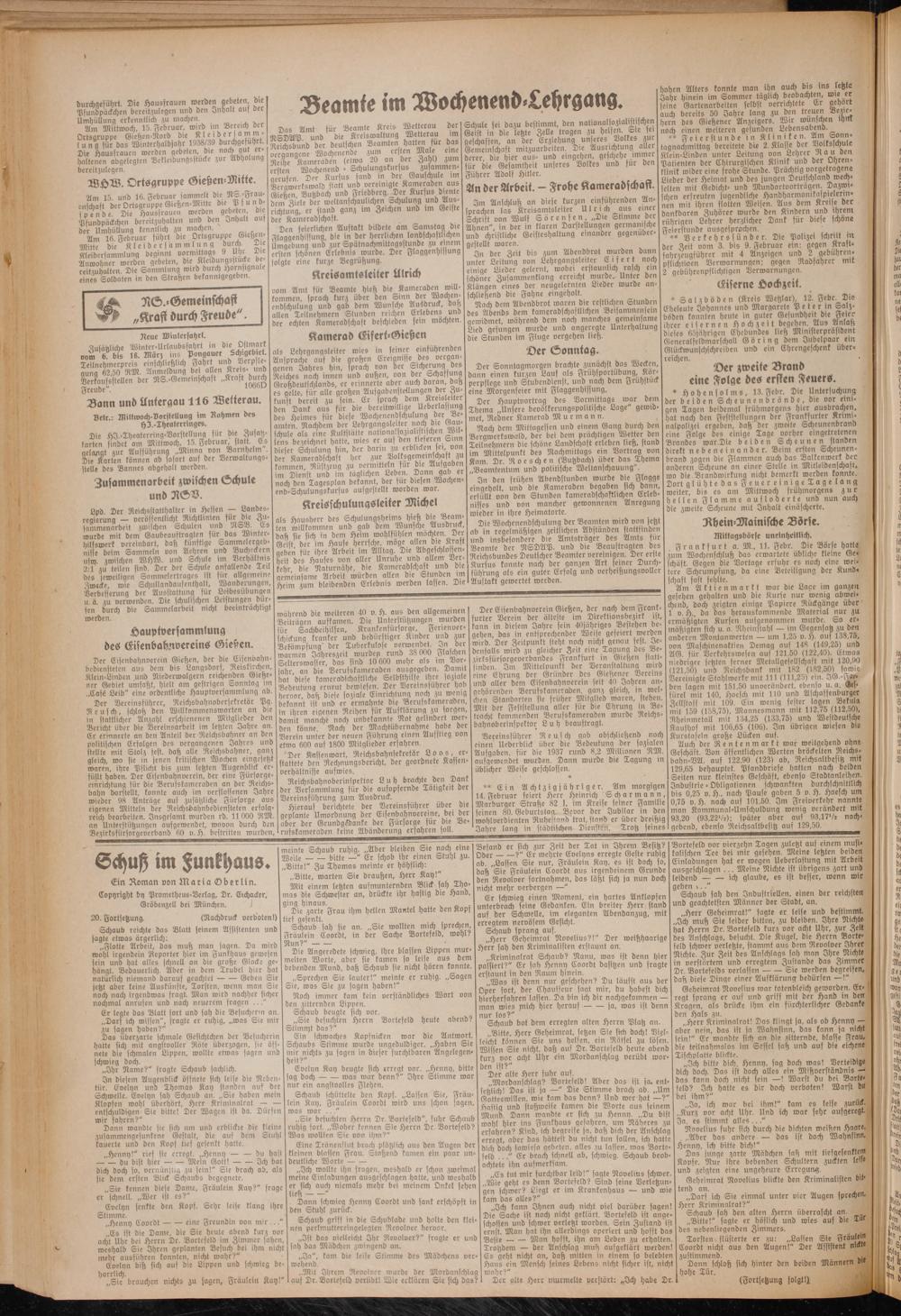 Das Amt für Beamte Kreis Wetterau Der NSDAP. unD die Kreiswaltung Wetterau im Reichsbund Der Deutschen Beamten hatten für das vergangene Wochenende zum er|ten Male eine Reihe Kameraden (etwa 20 an Der Zahl) zum ersten Wochenend - Schulungskursus zusammen- qerufen. Der Kursus fand in der Gauschule im Bergwerkswald statt und vereinigte Kameraden aus Gießen, Butzbach und Friedberg. T)er Kursus diente dem Ziele der weltanschaulichen Schulung und Ausrichtung, er stand ganz im Zeichen und im Geiste der Kameradschaft.