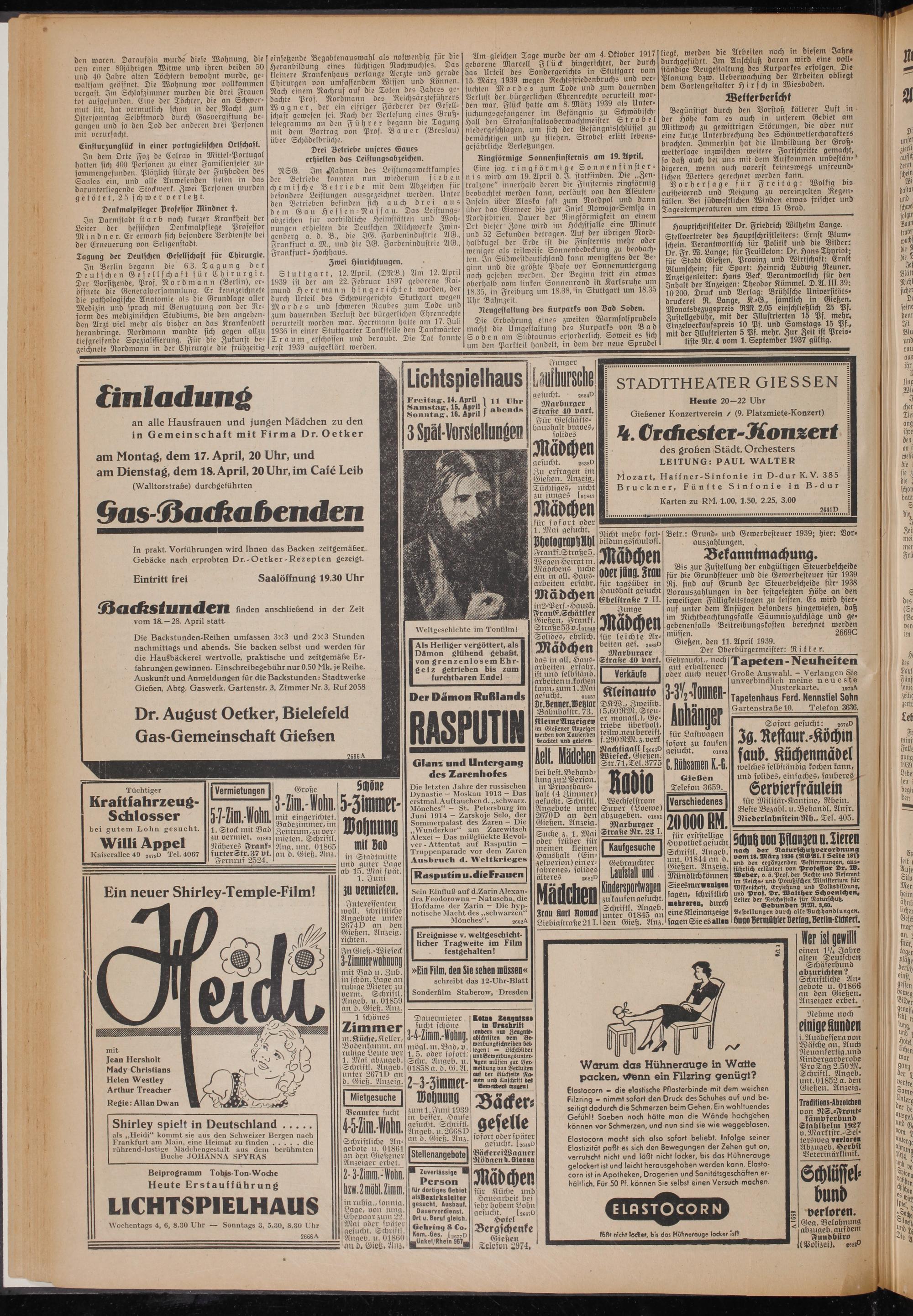 Hauptschriftleiter Dr. Friedrich Wilhelm Lange. Stellvertreter des Hauptschriftleiters: Ernst Blumschein. Verantwortlich für Politik und die Bilder: Dr. Fr. W. Lange; für Feuilleton: Dr. Hans Thyriot; für Stadt Gießen, Provinz und Wirtschaft: Ernst Blumschein; für Sport: Heinrich Ludwig Neuner. Anzeigenleiter: Hans Beck. Verantwortlich für den Inhalt der Anzeigen: Theodor Kümmel. D.A. 111.39: 10 200. Druck und Verlag: Brühlsche Universitätsdruckerei R. Lange, K--G., sämtlich in Gießen. Monatsbezugspreis RM. 2,05 einschließlich 25 Ps. Zustellgebühr, mit der Illustrierten 15 Pf. mehr« Einzelverkaufspreis 10 Pf. und Samstags 15 Pf., mit der Illustrierten 5 Pf. mehr. Zur Zeit ist Preis- liste Nr. 4 vom 1. September 1937 gültig.