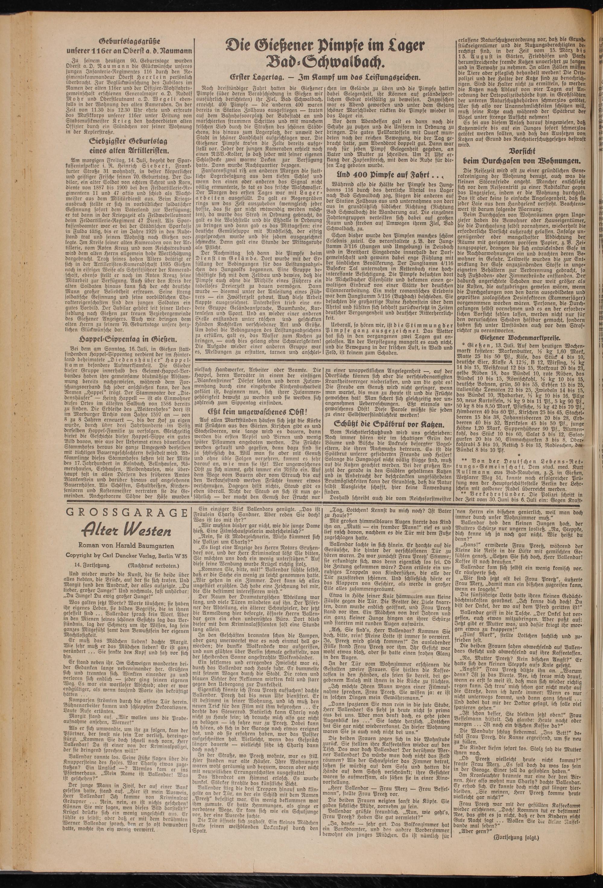 * Gießen, 13. Juli. Auf dem heutigen Wochenmarkt kosteten: Markenbutter, % kg 1,60 Mark, Matte 25 bis 50 Pf., Käse, das Stück 4 bis 10, deutsche Eier, Klasse A 12^, B 12, Wirsing, kg 14 bis 15, Weißkraut 12 bis 15, Rotkraut 20 bis 23, gelbe Rüben 18, das Bündel 10, rote Rüben, das Bündel 10 bis 15, Römischkohl, % kg 10 bis 15, deutsche Bohnen, grün, 50 bis 55, Erbsen 15 bis 25, italienische Tomaten 22 bis 25, Zwiebeln 14 bis 15, das Bündel 10, Rhabarber, % kg 10 bis 16, Pilze 50, neue Kartoffeln, % kg 9 bis 11 Pf., 5 kg 90 Pf., 50 kg 8 bis 8,50 Mark, Pfirsiche, kg 42 bis 70 Pf., Himbeeren 40 bis 60 Pf., Kirschen 25 bis 45, Stachel- beeren 15 bis 38, Johannisbeeren 20 bis 28, Erdbeeren 40 bis 52, Aprikosen 45 bis 50 Pf., junge Hähne 1,20 Mark, Suppenhühner 90 Pf., Blumenkohl, das Stück 10 bis 60, Salat 5 bis 12, Salat- gurten 20 bis 50, Einmachgurken 3 bis 8, Ober- kohlrabi 5 bis 10, Rettich 5 bis 15, Radieschen, dm Bündel 8 bis 10 Pf.