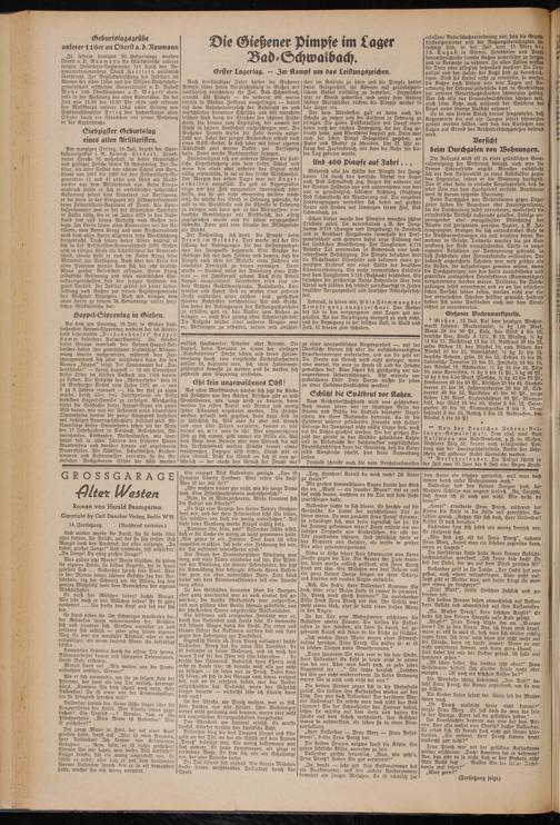 erreicht. 400 Pimpfe — die anderen 400 waren bereits in Station Zollhaus ausgestiegen — traten auf dem Bahnhofsvorplatz der Badestadt an und marschierten strammen Schrittes und mit manchem frischen Lied durch die Straßen des schönen Städtchens, bis hinaus zum Lagerplatz der unweit der Stadt in schöner Landschaft aufgeschlagen war. Die Gießener Pimpfe trafen die Zelte bereits aufgestellt vor. Jeder der jungen Kameraden erhielt noch einen NSV.-Kolter, so daß jeder mit seiner eigenen Schlafdecke zwei warme Decken zur Verfügung hatte. Dann wurde Nachtquartier bezogen.