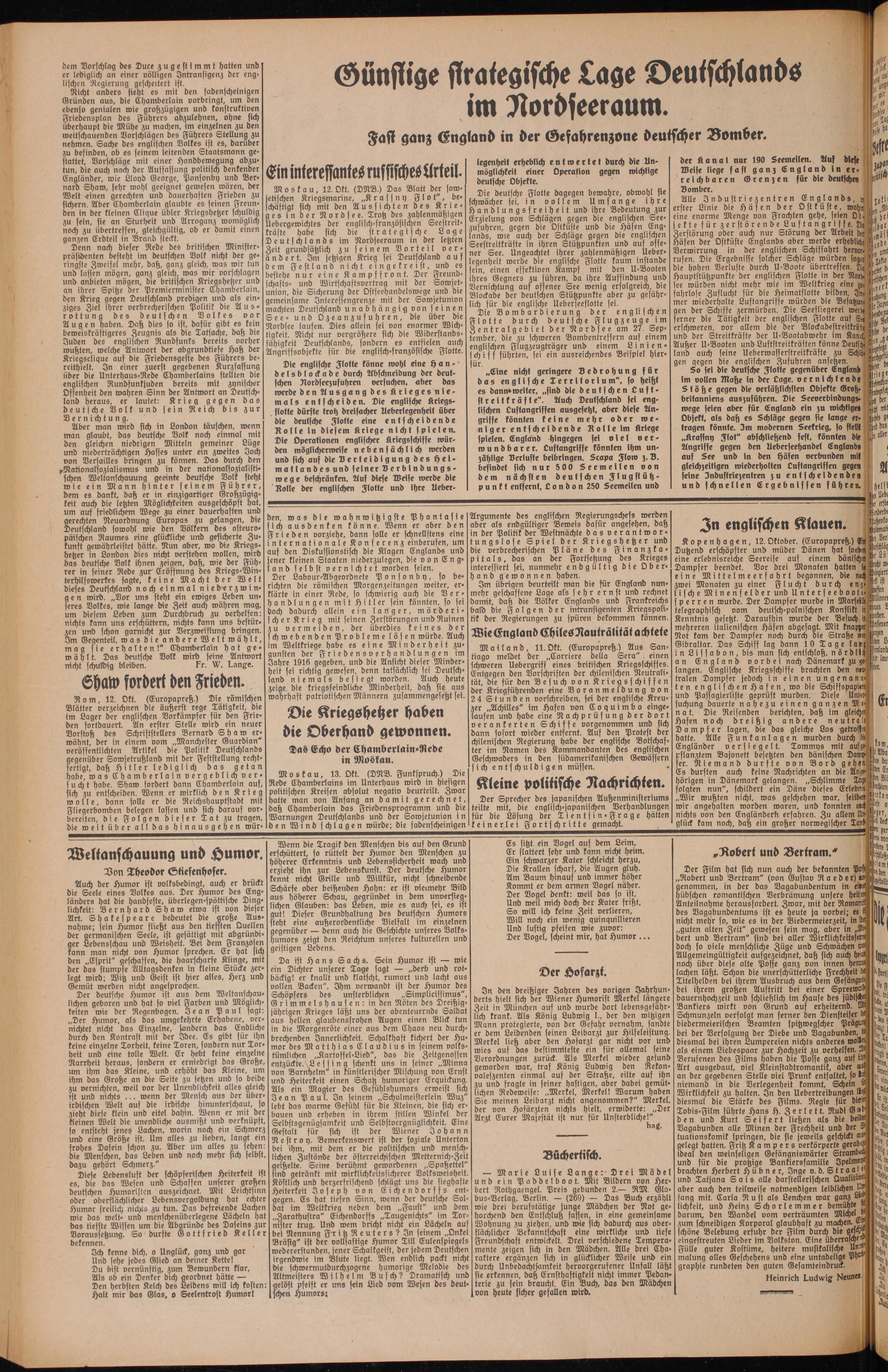 Im übrigen beurteilt man die für England nunmehr geschaffene Lage afs sehr e r n ft und rechnet damit, daß die Völker Englands und Frankreichs bald die Folgen ber intransigenten Kriegspolitik der Regierungen zu spüren bekommen können. Wie England ChilesNautrölität achtete