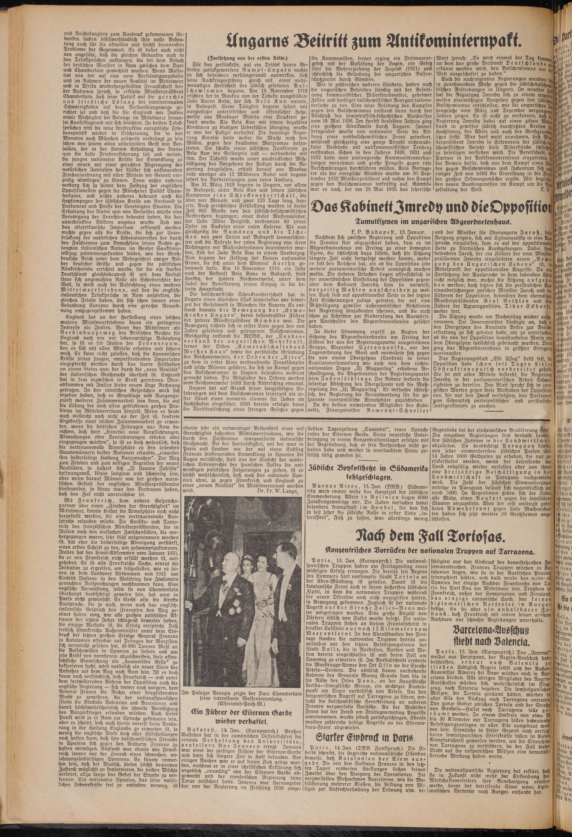 und in Afrika wiederhergestellten Freundschaft beider Nationen sprach, so erklärte Ministerpräsident Chamberlain, daß seine Politik auf die gerechte und friedliche Lösung der internationalen Schwierigkeiten auf dem Verhandlungswege gerichtet sei und daß die für England wie Italien vitale Wichtigkeit ber Belange im Mittelmeer keinerlei Konfliktsgrund mit sich brächten. In beiden Trinksprüchen tritt die neue konstruktive europäische Friedenspolitik wieder in Erscheinung, die in den Monaten nach München zeitweise verdrängt zu sein schien von jenem alten unheilvollen Geist von Versailles, der in der starren Erhaltung des Status quo die beste Friedenssicherung sah und meinte, die jungen nationalen Kräfte der Entwicklung zu einer neuen auf einer gerechten Abgrenzung ber natürlichen Interessen ber Völker sich aufbauenden Friedensordnung mit allen Mitteln der Gewalt vor- zeittg abwürgen' zu können. Denn nichts anderes verbarg sich ja hinter dem Feldzug der englischen Opposittonellen gegen die Münchener Politik Chamberlains, und nichts anderes bedeutet auch die Hetzkampagne der jüdischen Kreise um Roosevelt in