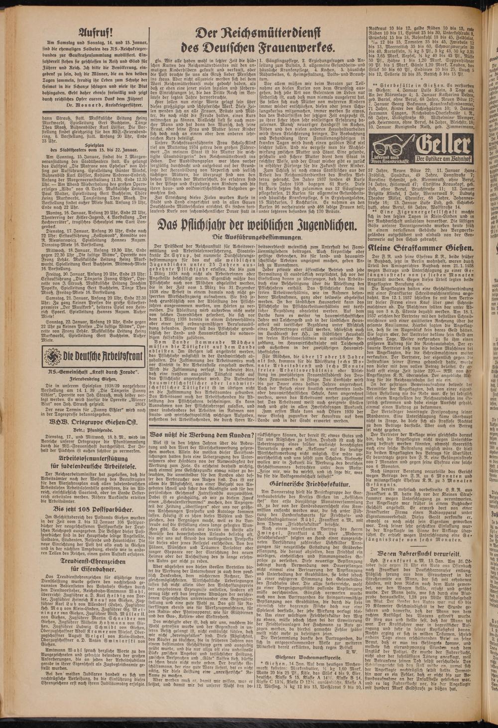 ** Sterbefälle in Gießen. Es verstärken in Gießen: 4. Januar Luise Klein, 3 Tage alt, An der Kläranlage 4; 5. Januar Katharina Velten', geb. Bartel, ohne Beruf, 68 Jahre, Neuen Baue 17; 7. Januar Georg Beckmann, Krankenkassenbeamter, 71 Jahre, hinter den Schießgärten 10; 9. Januar Hermann Czygan, Reichsbahn-Obersekretär i. R., 66 Jahre, Liebigsttaße 89; Wilhelmine Wemper, geb. Heiermann, ohne Beruf, 84 Jahre, Bleichstr. 18; 10. Januar Kunigunde Rath, geb. Zimmermann,