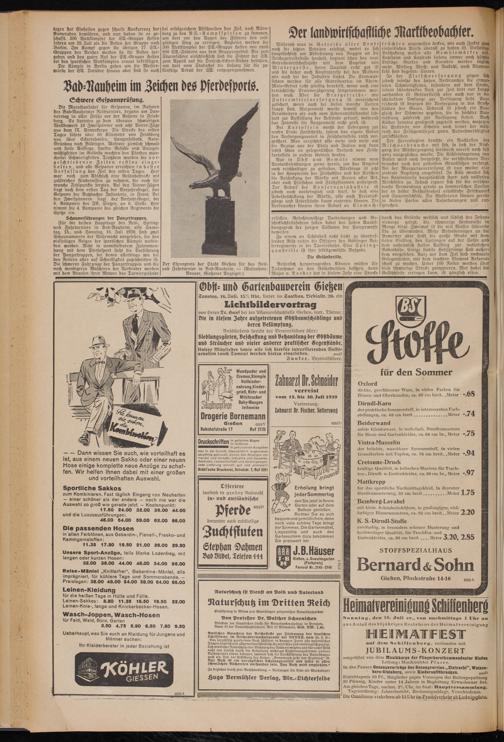 Die Marathonfahrt für Gespanne, im Rahmen des Bad-Nauheimer Reitturniers, begann am Donnerstag in aller Frühe vor der Kaserne in Friedberg. Es starteten zu dem überaus schwierigen Wettbewerb 19 Zweispänner und acht Vierer-Züge aus dem IX. Armeekorps. Die Strecke des ersten Tages führte über 60 Kilometer von Friedberg aus über Eckartshausen, Langenselbold, Rain- Gründau nach Büdingen. Mehrere ziemlich schmale und steile Anstiege, starkes Gefälle und Unregelmäßigkeiten im Gelände machten den Pferden mancherlei Schwierigkeiten. Trotzdem wurden die vorgeschriebenen Zeiten restlos eingehalten, und alle Gespanne erreichten in bester Verfassung das Ziel des ersten Tages. Hier war noch zum Abschluß eine Geländestrecke mit zahlreichen Hindernissen zu nehmen, die noch für manche Fehlpunkte sorgten. Bei den Vierer-Zügen liegt nach dem ersten Tag der Vorjahrssieger, das Gespann der Butzbacher Infanterie, in Front. Bei den Zweispännern liegt der Vorjahrssieger, die 8. Kompanie des JR. Siegen, an 6. Stelle. Hier nimmt die 4. Kompanie des gleichen Regiments die Spitze ein.