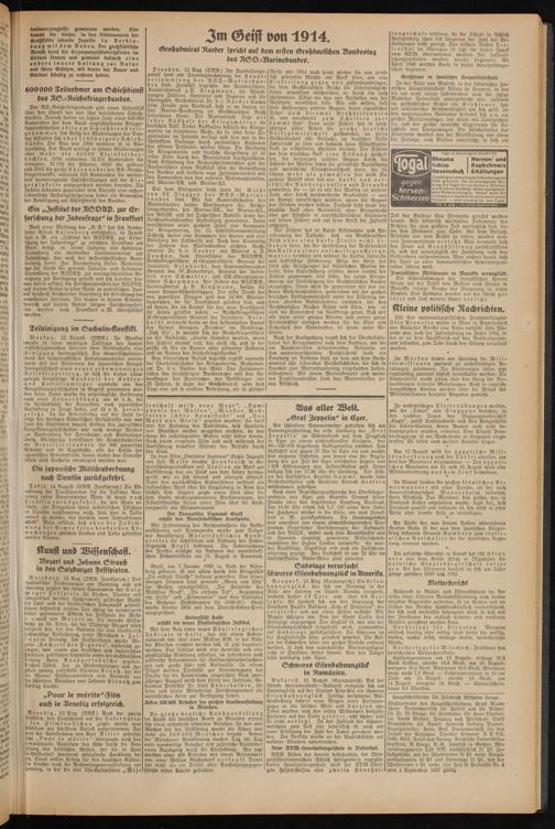 Von stürmischem Beifall begrüßt ergriff nunmehr der Oberbefehlshaber der Kriegsmarine, Großadmiral Dr. h. c. Raeder das Wort. Das Zusammenfällen des diesjährigen Bundestages mit den Gedenktagen des Ausbruches des Weltkrieges vor 25 Jahren, so sagte der Großadmiral, gebe dem Tage eine um so ernstere Bedeutung, als in gleicher