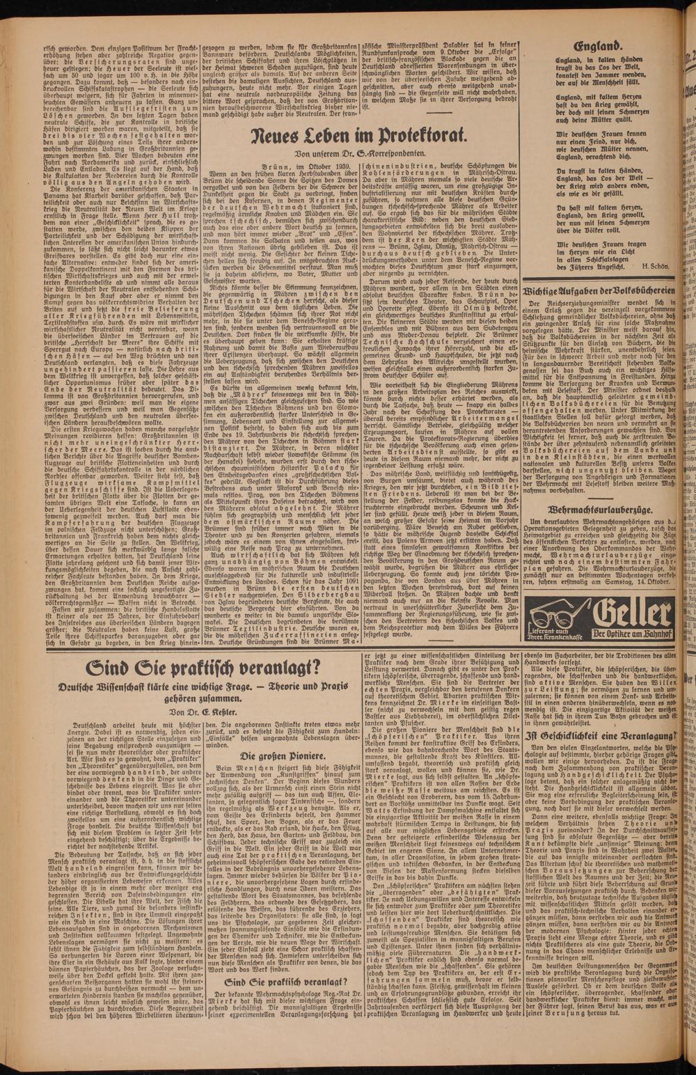 Darum wird auch jeder Reisende, der heute durch Mähren wandert, vor allem in den Städten einen absolut deutschen Charakter finden. Brünn besitzt sein deuffches Theater, das Schauspiel, Oper und Operette pflegt. Ebenso ist Olmütz bestrebt, ein gleichwertiges deuffches Kunstinstitut zu erhalten. Die kleineren Städte werden mit diesen beiden Ensembles und mit Bühnen aus dem Sudetengau und aus Nieder-Donau bespielt. Die Brünner Technische Hochschule verzeichnet einen erfreulichen Zuwachs ihrer Hörerzahl, und die allaemeinen Grund- und Hauptschulen, die jetzt nach dem Lehrplan des Mtreichs umgestellt wurden, weifen gleichfalls einen außerordentlich starken Zustrom deutscher Schüler auf.