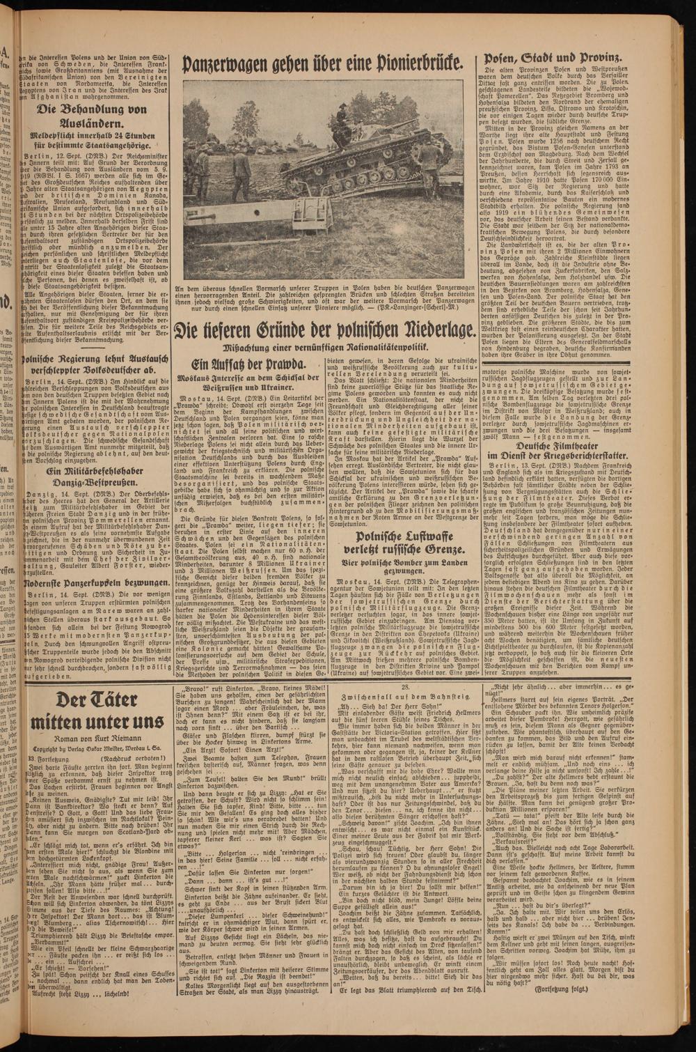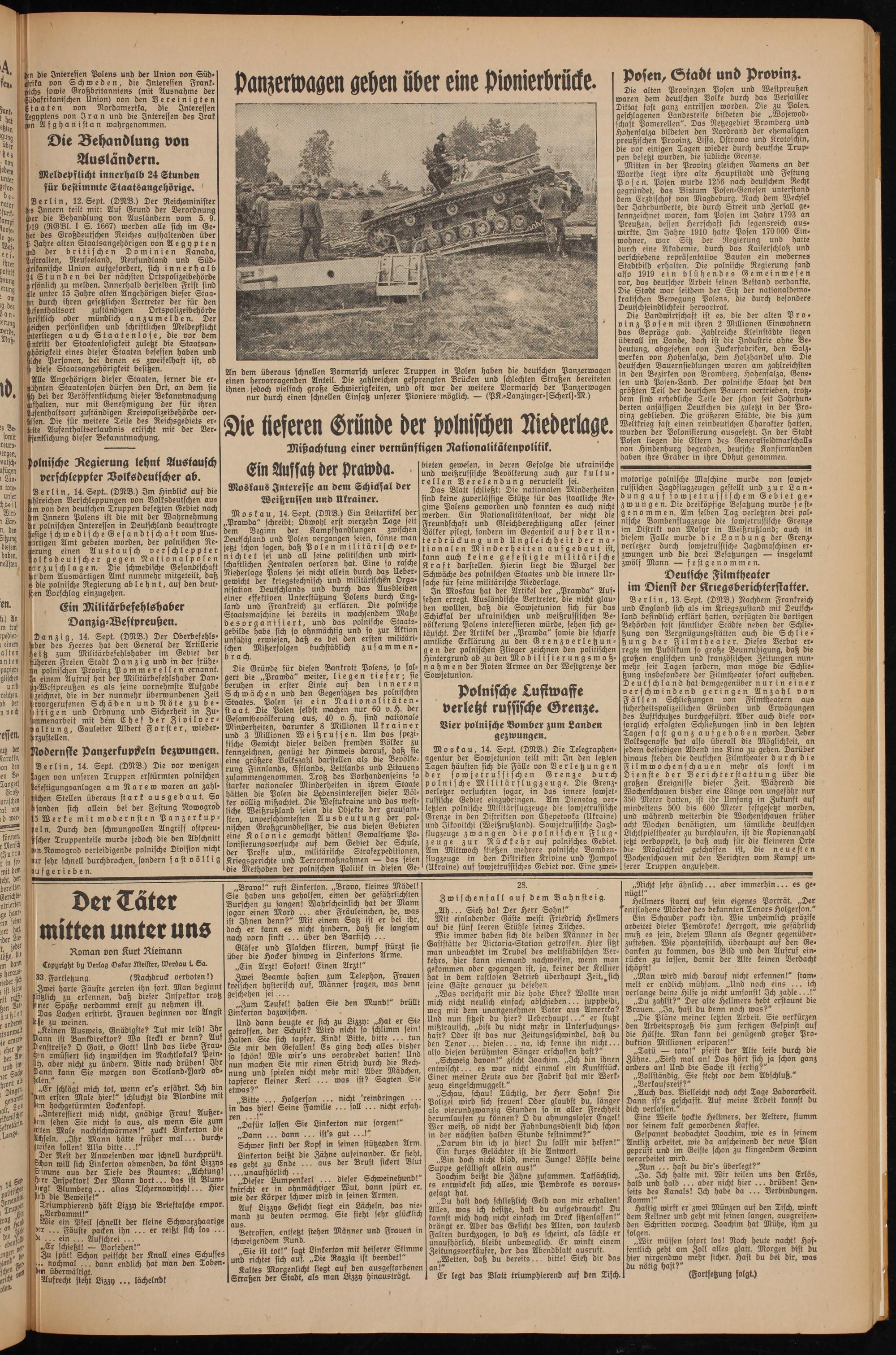 An dem überaus schnellen Vormarsch unserer Truppen in Polen haben die deutschen Panzerwagen einen hervorragenden Anteil. Die zahlreichen gesprengten Brücken und schlechten Straßen bereiteten ihnen jedoch vielfach große Schwierigkeiten, und oft war der weitere Vormarsch der Panzerwagen nur durch einen schnellen Einsatz unserer Pioniere möglich. — (PK.-Lanzinger-(Scherls -M.)