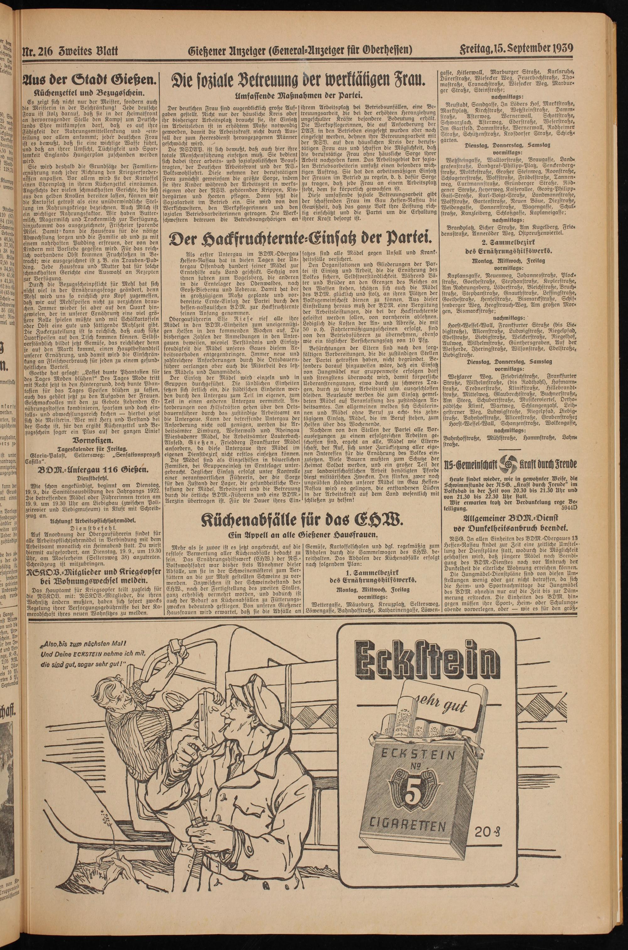 Obergauführerin Else Riese rief alle ihre Mädel in den BDM.-Einheiten zum uneigennützigen Helfen in den kommenden Wochen auf. Die bisherigen Zahlen der Anmeldungen in den Unter- gauen beweisen, wieviel Verständnis und Einsatz- freudigkeit die Mädel unseres Gaues diesem Arbeitsvorhaben entgegenbringen. Immer neue und zahlreichere Anforderungen durch die Ortsbauernführer verlangen aber auch die Mitarbeit des letzten Mädels und Jungmädels.