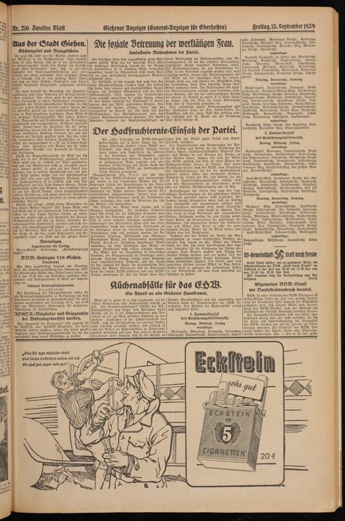 Mehr als je zuvor ist es jetzt angebracht, auf die restlose Verwertung aller Küchenabfälle bedacht zu sein. Das Ernährungshilfswerk (EHW.) der 916.= Volkswohlfahrt war bisher stets Abnehmer dieser Abfälle, um sie in der Schweinemästerei zum Verfüttern an die zur Mast gestellten Schweine zu verwenden. Inzwischen ist der Schweinebestand des EHW., nach der Fertigstellung des zweiten Stalles, ganz erheblich vermehrt worden, und dadurch ist auch der Bedarf an Küchenabfällen zu Fütterungs- Zwecken bedeutend gestiegen. Von unseren Gießener Hausfrauen wird erwartet, daß sie die Abfälle an