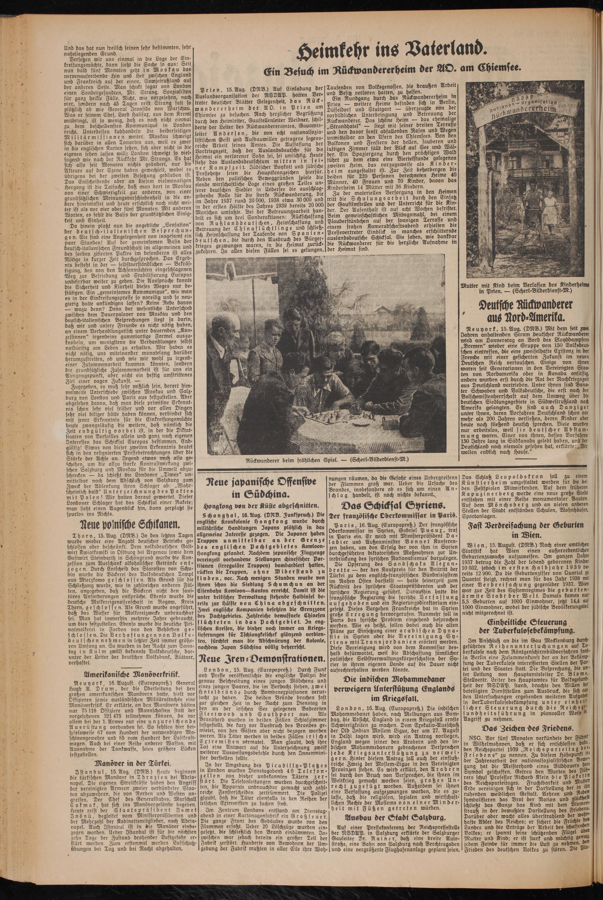 Prien, 15. Aug. (DNB.) Auf Einladung der Auslandsorganisatton der NSDAP, hatten Ser- treter deutscher Blätter Gelegenheit, das Rückwandererheim der AO. in Prien am Chiemsee zu besuchen. Nach herzlicher Begrüßung durch den Heimleiter, Gaustellenleiter Weidner, schilderte der Leiter des Rückwandereramtes, Gauamtsleiter Andersen, die von echt nationalsozialistischem Geist und Aufbauwillen getragene segensreiche Arbeit seines Amtes. Die Auffassung der Vorkriegszeit, daß der Ausländsdeutsche für die Heimat ein verlorener Sohn sei, sei unrichtig, heute stehe das Auslandsdeutschtum mitten in feiner Kampfzeit. Jüdischer Boykott und jüdische Pressehetze seien die Hauptkennzeichen hierfür. Neben den politischen Beweggründen spiele die elende wirtschaftliche Lage eines großen Teiles unsrer deutschen Siedler in Ueberfee die ausschlaggebende Rolle für die starke Rückwanderung, die im Jahre 1937 rund 20 000, 1938 etwa 30 000 und in der ersten Hälfte des Jahres 1939 bereits 20 000 Menschen umfaßte. Bei der Betreuungsarbeit handelt es sich um drei Sonderaktionen: Rückschaffung von R u ß l a n d d e u t f ch en , Heimschaffung und Betreuung der Chinaflüchtlinge und schließlich Heimschaffung der Taufende von Spa n i e n - deutschen, die durch den Ausbruch des Bürgerkrieges gezwungen waren, in die Heimat zu ruckzukehren. In allen diesen Fällen fei es gelungen,