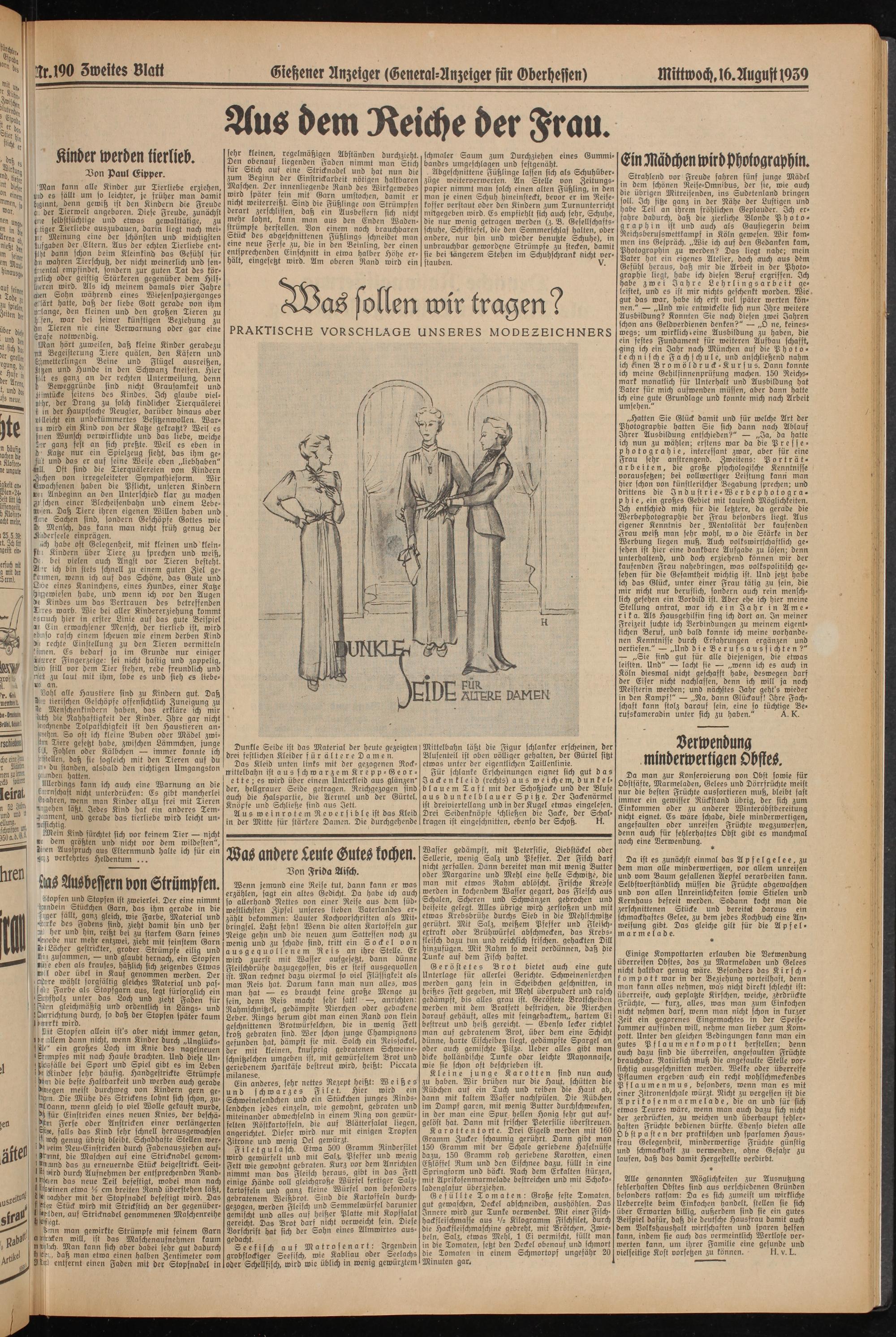 Strahlenb vor Freube fahren fünf junge Möbel in bem schönen Reise-Omn'bus, ber sie, wie auch bie übrigen Mitreisenben, ins Subetenland bringen soll. Ich sitze ganz in ber Nähe ber Lustigen unb habe Teil an ihrem fröhlichen ©eplauber. Ich erfahre baburch, baß bie zierliche Blonbe Photographin ist unb auch als Gausiegerin beim Reichsberufswettkampf in Köln gewesen. Wir kommen ins Gespräch. „Wie ich auf ben Gedanken kam, Photographin zu werden? Das liegt nahe; mein Vater hat ein eigenes Atelier, doch auch aus bfcm Gefühl heraus, baß mir bie Arbeit in der Photographie liegt, habe ich biefen Beruf ergriffen. Ich habe zwei Jahre L e h r l i n g s a r b e i t geleistet, und es ist mir nichts geschenkt worben. Wie gut bas war, habe ich erst viel später werten können." — „Und wie entwickelte sich nun Ihre weitere Ausbilbung? Konnten Sie nach biefen zwei Jahren schon ans Gelboerbienen benfen?" — „O ne, keineswegs; um wirklich.eine Ausbildung zu haben, die ein festes Funbament für weiteren Aufbau schafft, gina ich ein Jahr nach München auf bie Photo- technische Fachschule, und anschließend nahm ich rinen Bromölbruck-Kursus. Dann konnte ich meine Gehilfinnenprüfung machen. 150 Reichsmark monatlich für Unterhalt und Ausbildung hat Vater für mich aufroenben müssen, aber bann hatte ich eine gute Grundlage unb konnte mich nach Arbeit umsehen."