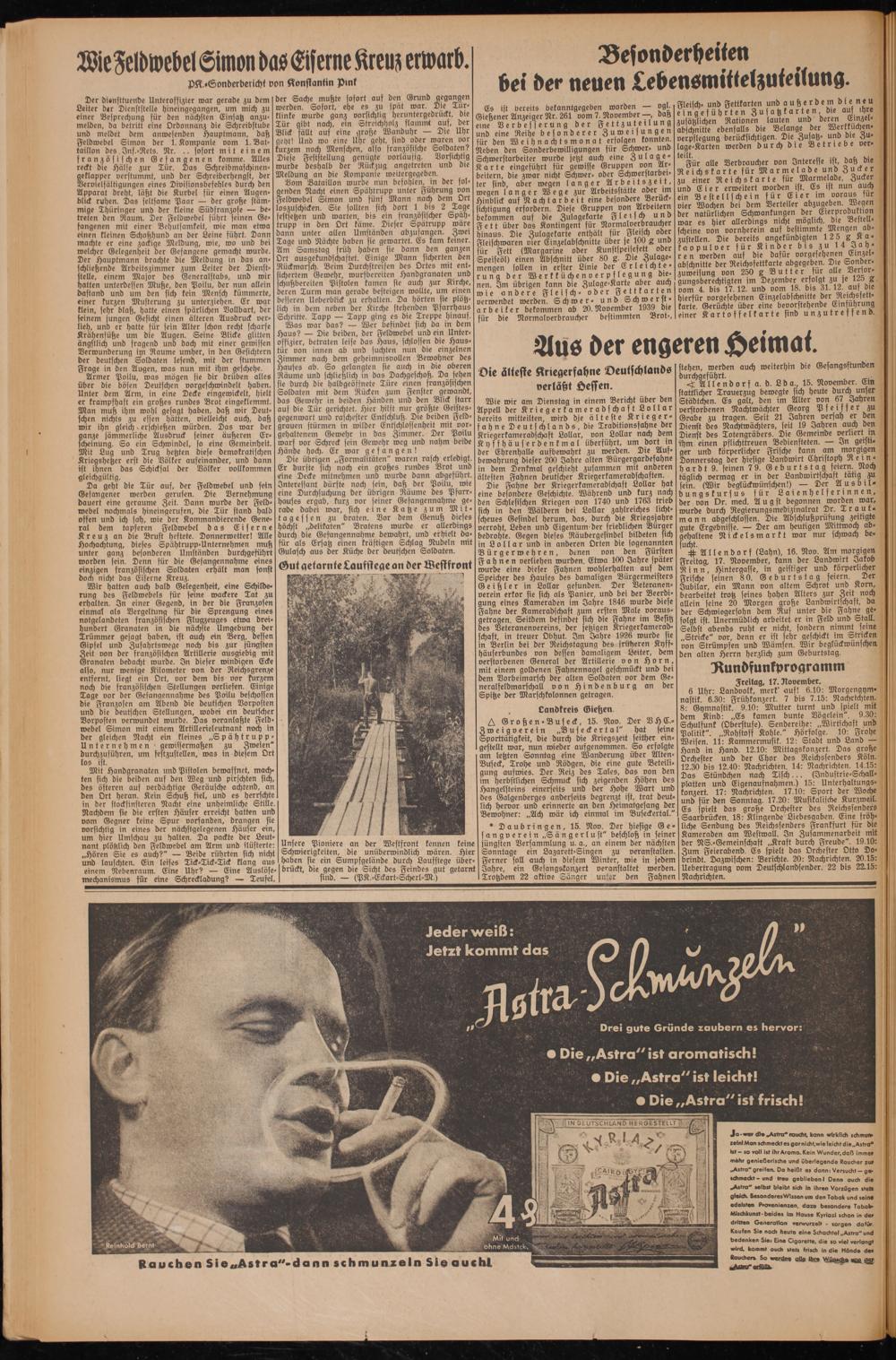# Alle ndorf (Lahn), 16. Nov. Am morgigen Freitag, 17. November, kann der Landwirt Jakob Rinn, Hintergasse, in geistiger und körperlicher Frische seinen 8 0. Geburtstag feiern. Der Jubilar, ein Mann von altem Schrot und Korn, bearbeitet trotz seines hohen Alters zur Zeit noch allein seine 20 Morgen große Landwirtschaft, da der Schwiegersohn dem Ruf unter die Fahne gefolgt ist. Unermüdlich arbeitet er in Feld und Stall. Selbst abends ruht er nicht, sondern nimmt seine „Stricke" vor, denn er ist sehr geschickt im Stricken von Strümpfen und Wämsen. Wir beglückwünschen den alten Herrn herzlich zum Geburtstag.