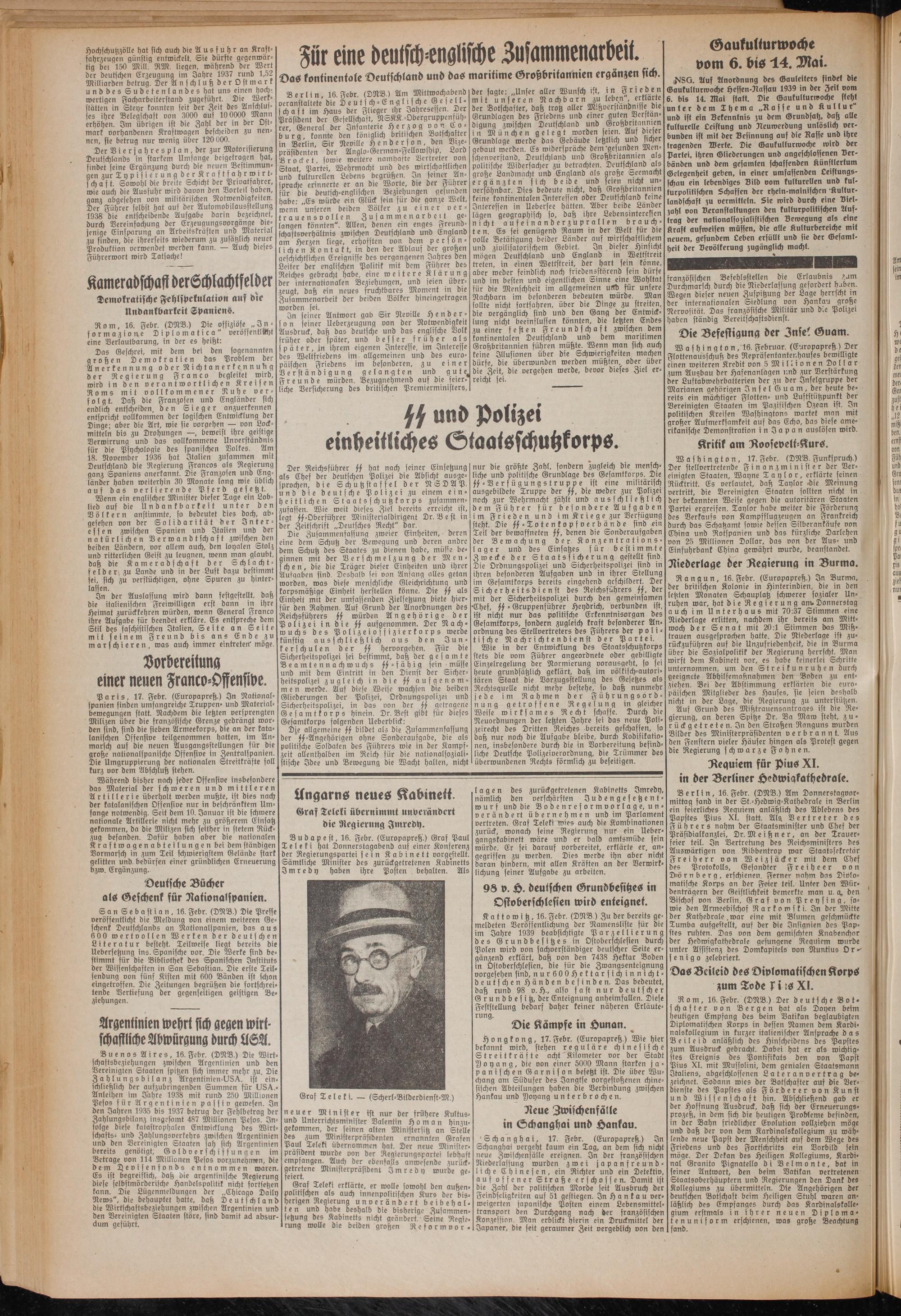 Wenn ein englischer Minister dieser Tage ein Loblied auf die Undankbarkeit unter den Völkern anstimmte, so bedeutet dies doch, abgesehen von der Solidarität her Interessen zwischen Spanien und Italien und der natürlichen Verwandt sch aft zwischen den beiden Ländern, vor allem auch, den loyalen Stolz und ritterlichen Geist zu leugnen, wenn man glaubt, daß die Kameradschaft der Schlachtfelder zu Lande und in der Luft dazu bestimmt sei, sich zu verflüchtigen, ohne Spuren zu hinterlassen.