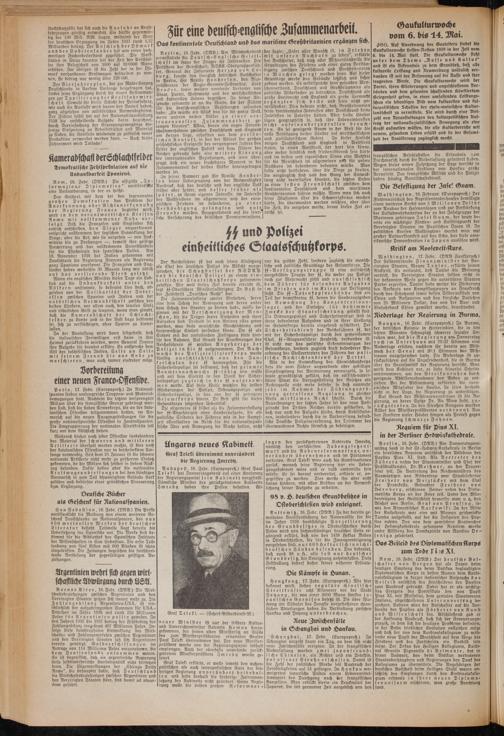 Die Zusammenfassung zweier Einheiten, • deren eine dem Schutz der Bewegung und deren andre dem Schutz des Staates zu dienen habe, müße beginnen mit der Verschmelzung der Meuchen, die die Träger dieser Einheiten und ihrer Aufgaben sind. Deshalb sei von Anfang alles getan worden, was diese menschliche Gleichrichtung und korpsmäßige Einheit Herstellen könne. Die jj als Einheit mit der umfassenden Zielsetzung biete hier- ür den Rahmen. Auf Grund der Anordnungen des leichsführers jf würden Angehörige der Polizei in die jj ausgenommen. Der Nachwuchs des Polizeioffizierkorps werde künftig ausschließlich aus den Junkerschulen der ff hervorgehen. Für die Sicherheitspolizei fei bestimmt, daß der gesamte Beamtennachwuchs ff- fähig fein - muffe und mit dem Eintritt in den Dienst der Sicherheitspolizei zugleich in die ff ausgenommen werde. Aus diese Weise wachsen die beiden Gliederungen der Polizei, Ordnungspolizei und Sicherheitspolizei, in das von der ff getragene Gesamtkorps hinein. Dr. Best gibt für dieses Gesamtkorps folgenden Ueberblicf: