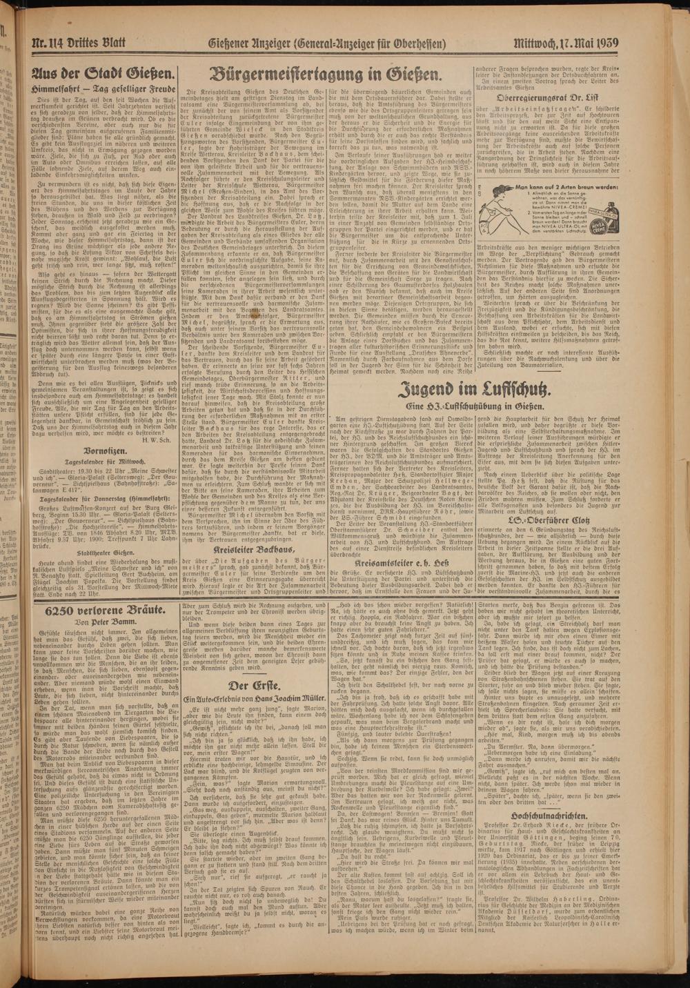 Großes Luftwaften-Konzert auf der Burg Gleiberg, Beginn 15.30 Uhr. — Gloria-Palast (Seltersweg): „Der Gouverneur". — Lichtspielhaus (Bahnhofstraße): „Die Hochzeitsreise". — Himibelsahrts- Ausflüge: TV. von 1846 Abfahrt 8.20 Uhr, MTV. Abfahrt 9.57 Uhr; 1900: Treffpunkt 7 Uhr Lahnbrücke.