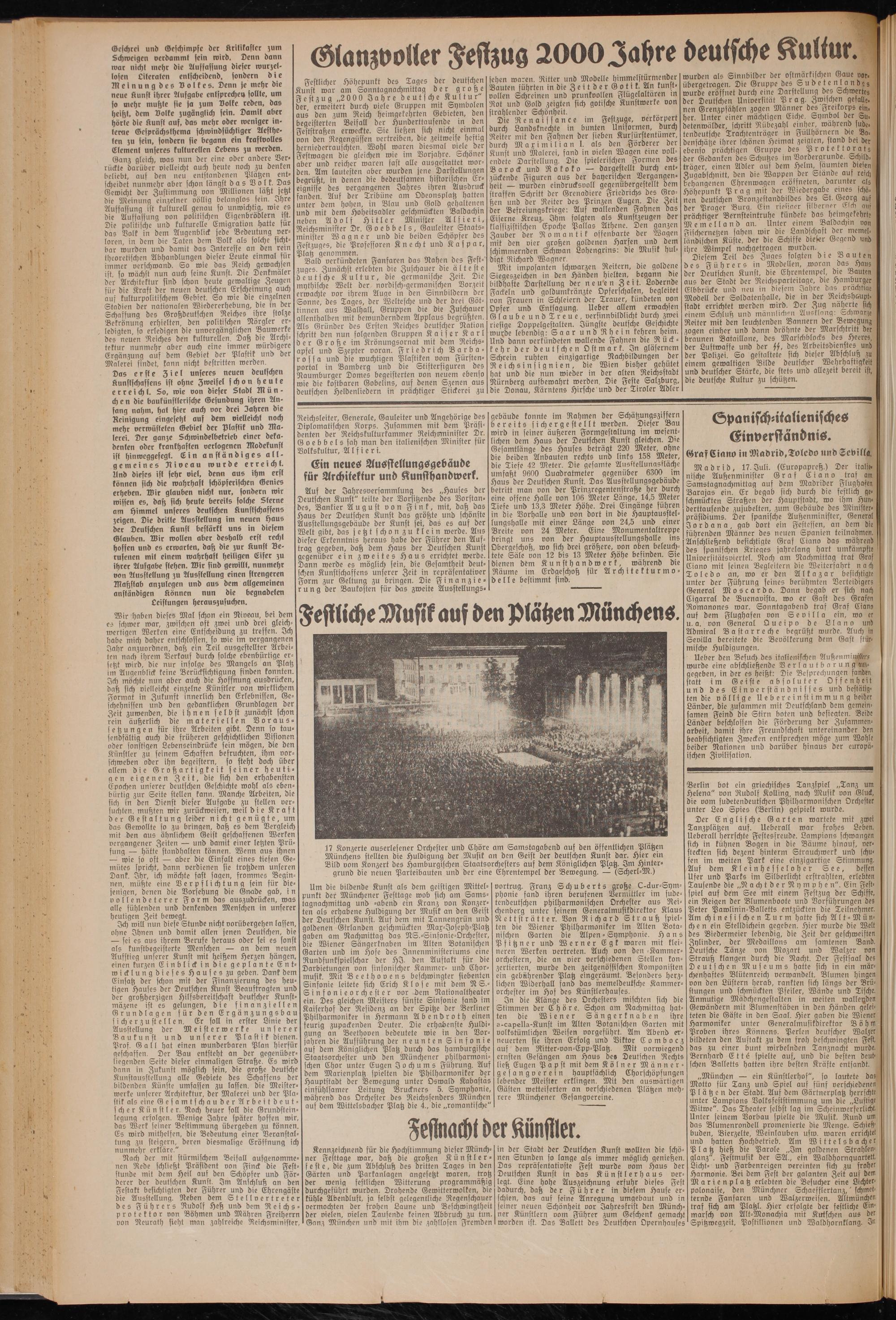 Nach der mit stürmischem Beifall aufgenommenen Rede schließt Präsident von Finck die Feststunde mit dem Heil auf den Schöpfer und Förderer der deutschen Kunst. Im Anschluß an den Festakt besichtigten der Führer und die Ehrengäste die Ausstellung. Neben dem Stellvertreter des Führers Rudolf Heß und dem Reichs- Protektor von Böhmen und Mähren Freiherrn von Neurath sieht man zahlreiche Reichsminister,