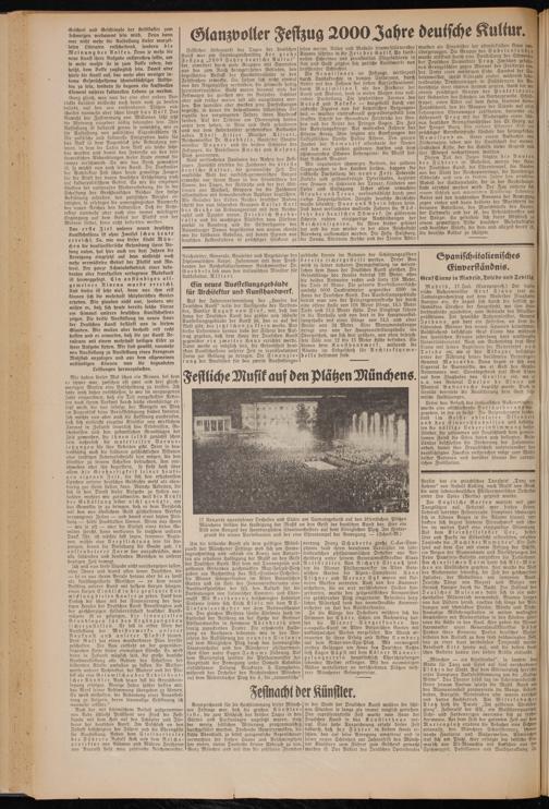Kennzeichnend für die Hochstimmung dieser Münchner Festtage war, daß die großen Künstlerfeste, die zum Abschluß des dritten Tages in den Gärten und Parkanlagen angesetzt waren, trotz der wenig festlichen Witterung programmäßig durchgeführt wurden. Drohende Gewitterwolken, die kühle Abendluft, ja selbst gelegentliche Regenschauer vermochten der frohen Laune und Beschwingtheit der vielen, vielen Tausende keinen Abbruch zu tun. Ganz München und mit ihm die zahllosen Fremden