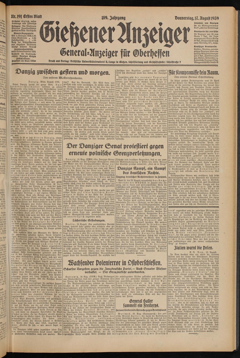 Erscheint täglich, außer Sonntags und Feiertags Beilagen: Die Illustrierte Gießener Familienblätter Heimat im Bild • DieScholle Monatr-Vezugspreis: