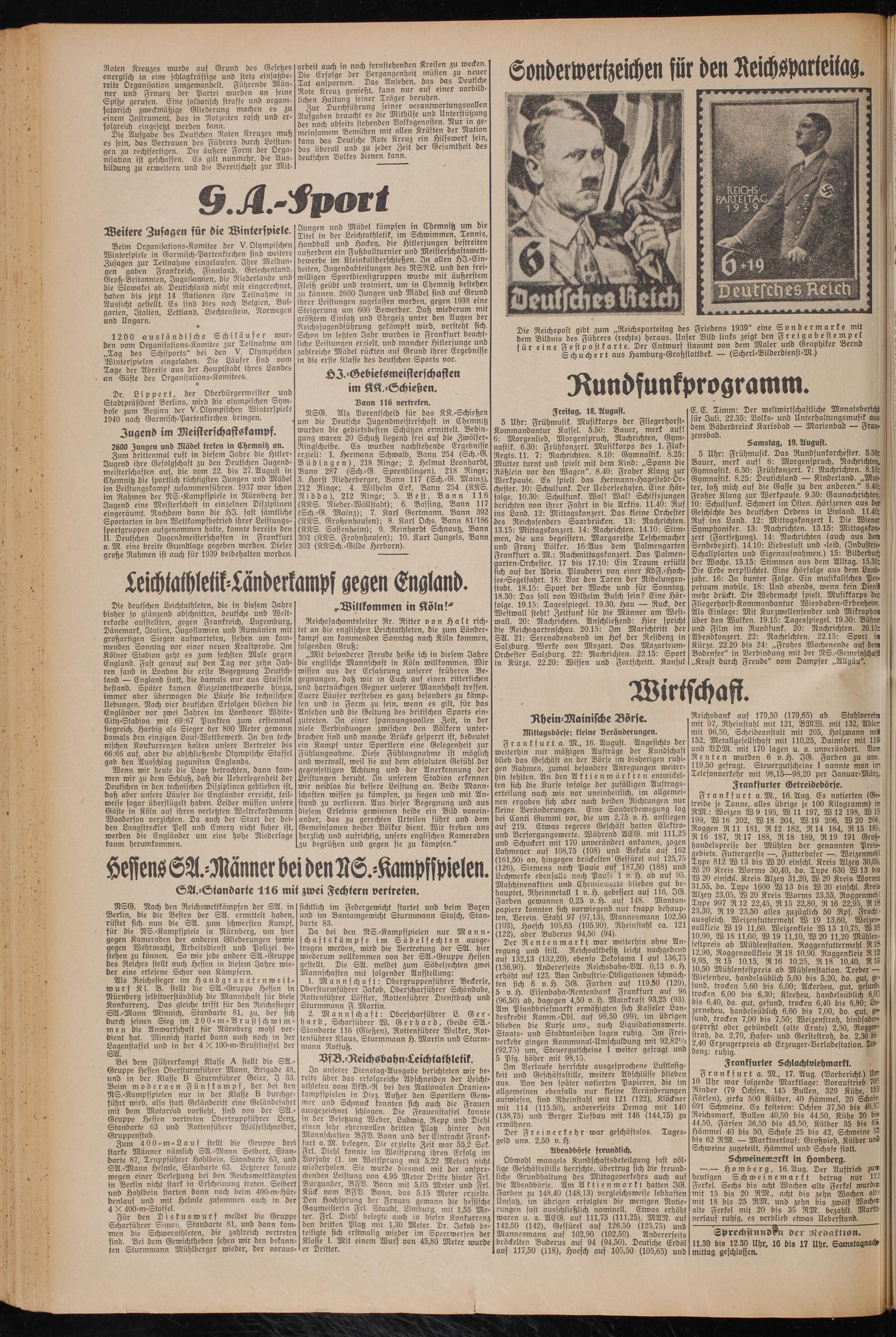NSG. Nach den Reichswettkämpfen der SA. in Berlin, die die Besten der SA. ermittelt haben, rüstet sich- nun die SA. zum schwersten Kampf, für die NS.-Kampfspiele in Nürnberg, um hier gegen Kameraden der anderen Gliederungen sowie gegen Wehrmacht, Arbeitsdienst und Polizei bestehen zu können. So wie jede andere SA.-Gruppe des Reiches stellt auch Hessen in diesem Jahre wieder eine erlesene Schar von Kämpfern.