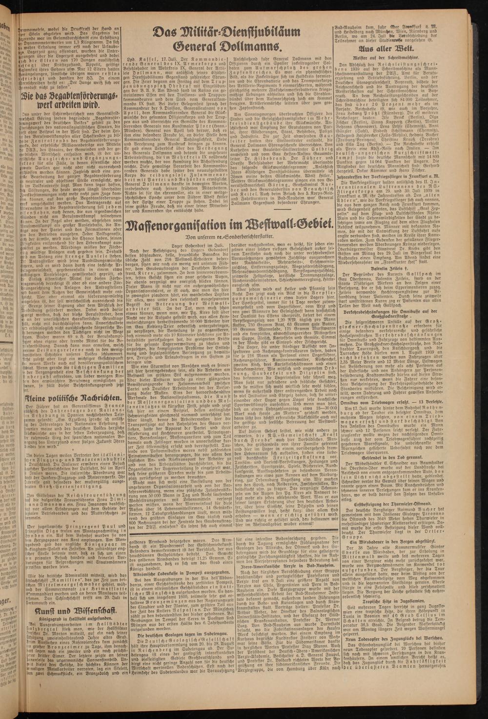 Am Sonntagmorgen überbrachten Offiziere des Stabes und die Gefolgschaftsmitglieder im Wehrkreisdienstgebäude ihre Glückwünsche. Anschließend war Empfang der Gratulanten von Partei, ihrer Gliederungen, Staat, Behörden, Polizei und Industrie. Die zur Zeit abwesenden Gauleiter hatten ihre Stellvertreter entsandt, die General Dollmann Ehrengeschenke überreichten. Don Kurhessen war Gauleiter-Stellvertreter S o l b r i g anwesend und vom Gau Hessen-Nassau Gauamtsleiter Dr. Hildebrand. Der Führer und Oberste Befehlshaber der Wehrmacht übersandte das folgende Glückwunschtelegramm: „Anläßlich Ihres 40jährigen Dienstjubiläums übermittele ich Ihnen meine besten Glückwünsche. Adolf Hitler." Weitere Glückwunschtelegramme gingen ein von Generalfeldmarschall Göring, Großadmiral Rae- d e r und den Generalobersten von Brauchitsch und Keitel. Auch beim Besuch des 5. Korps-Reit- und Fahrtturniers in Bad-Nauheim mar General Dollmann Gegenstand besonderer Ehrungen.