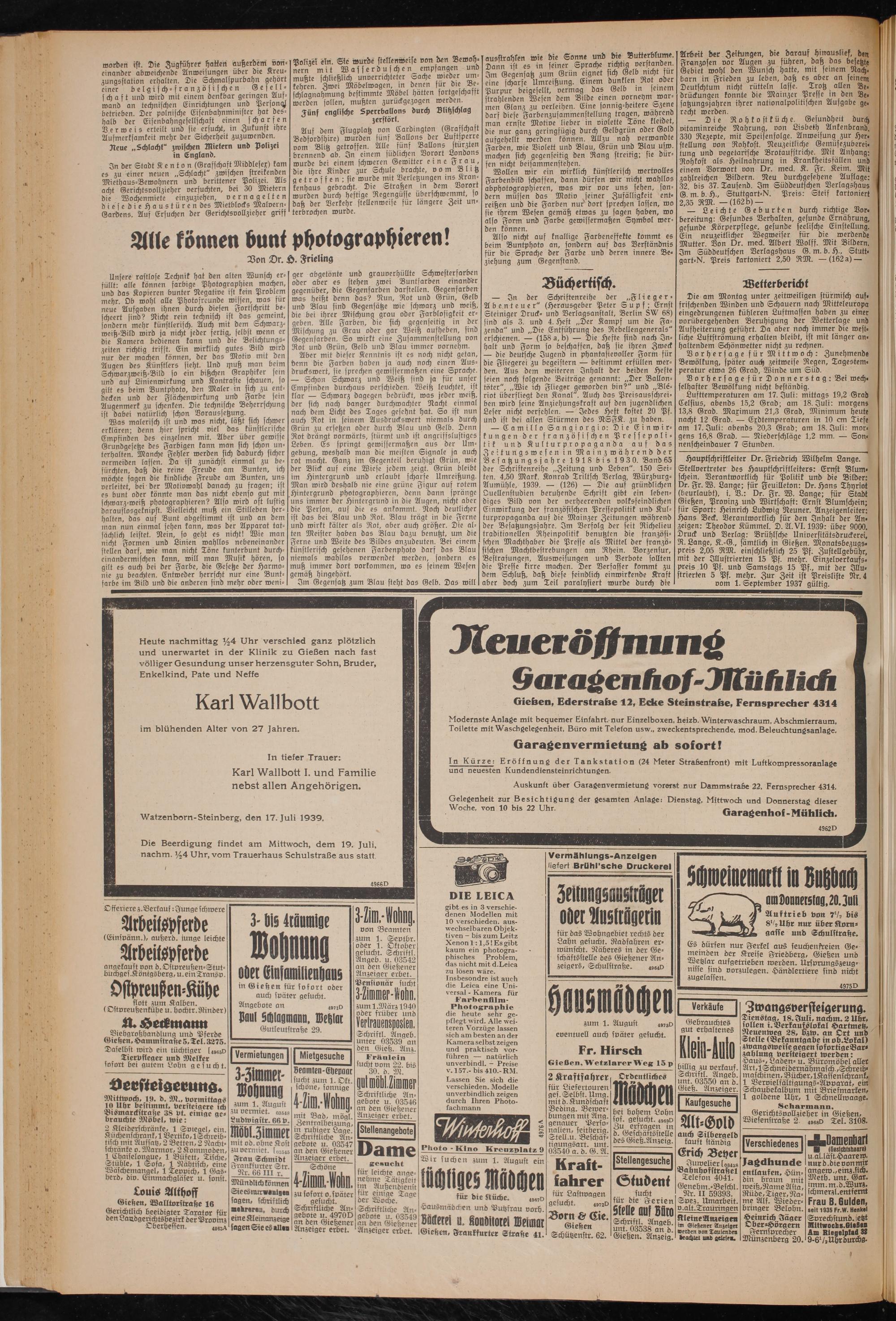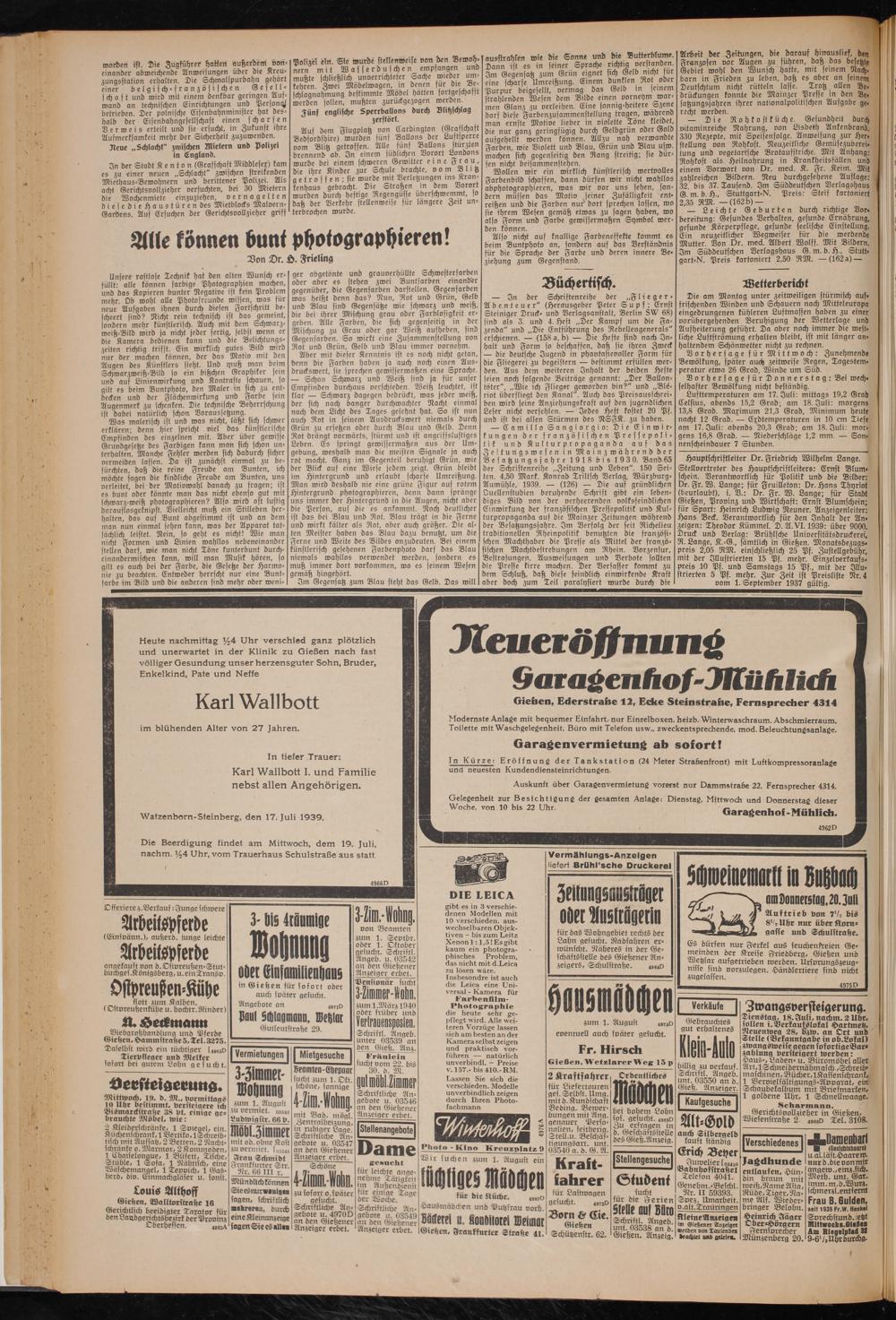 Hauptschriftleiter Dr. Friedrich Wilhelm Lange. Stellvertreter des Hauptschriftleiters: Ernst Blum» schein. Verantwortlich für Politik und die Bilder: Dr. Fr. W. Lange; für Feuilleton: Dr. Hans Thyriot (beurlaubt), i. 23.: Dr. Fr. W. Lange; für Stadt Gießen, Provinz und Wirtschaft: Ernst Slumfd)ein; für Sport: Heinrich Ludwig Neuner. Anzeigenleiter: Hans Beck. Verantwortlich für den Inhalt der An« zeigen: Theodor Kümmel. 2). 21. VI. 1939: über 9000. Druck und Verlag: Brühlsche Universitätsdruckerei, R. Lange, K.-G., sämtlich in Gießen. Monatsbezuqs* preis 2,05 RM. einschließlich 25 Pf. Zustellgebühr, mit der Illustrierten 15 Pf. mehr. Einzelverkaufs, preis 10 Pf. und Samstags 15 Pf., mit der Jllu- strierten 5 Pf. mehr. Zur Zeit ist Preisliste Nr. 4 vom 1. September 1937 gültig.