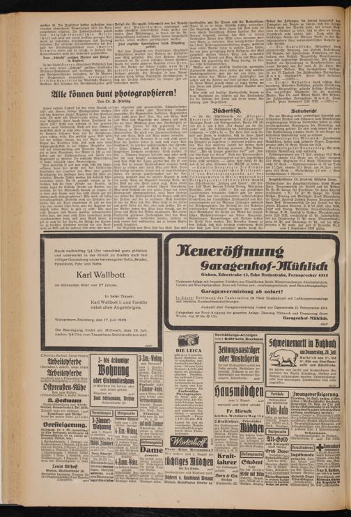 Auskunft über Garagenvermietung vorerst nur Dammstraße 22, Fernsprecher 4314. Gelegenheit zur Besichtigung der gesamten Anlage; Dienstag, Mittwoch und Donnerstag dieser Woche, von io bis 22 Uhr. Garagenhof-Mählich.