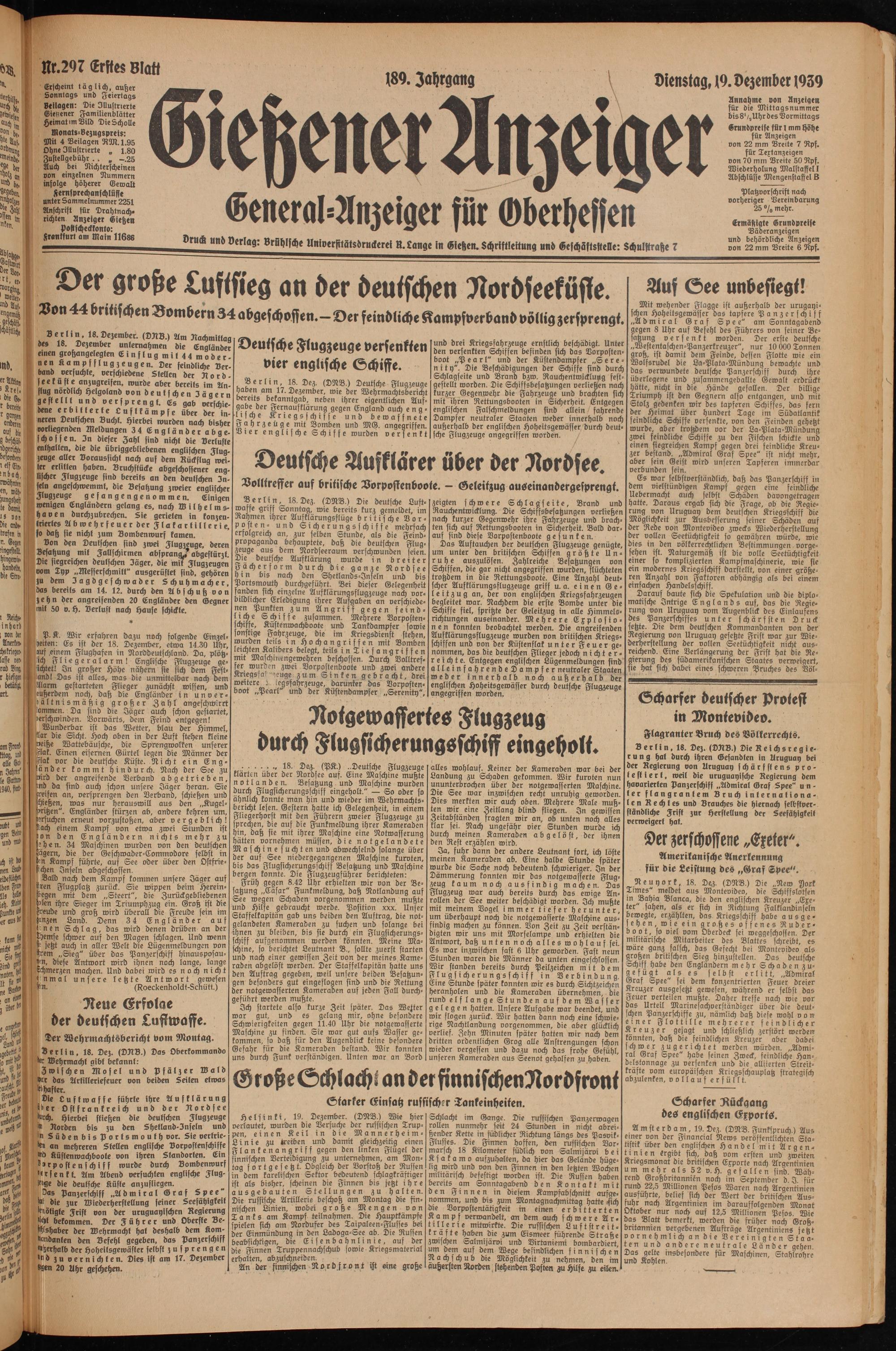 Mit wehender Flagge ist außerhalb der urugayi- schen Hoheitsgewässer das tapfere Panzerschiff „Admiral Graf Spee" am Sonntagabend gegen 8 Uhr auf Befehl des Führers von seiner Besatzung versenkt worden. Der erste deutsche „Westentaschen-Panzerkreuzer", nur 10 000 Tonnen groß, ist damit dem Feinde, dessen Flotte wie ein Wolfsrudel die La-Plata-Mündung bewachte und das verwundete deutsche Panzerschiff durch ihre überlegene und zusammengeballte Gewalt erdrückt hätte, nicht in die Hände gefallen. Der billige Triumph ist den Gegnern also entgangen, und mit Stolz gedenken wir des tapferen Schiffes, das fern der Heimat über hundert Tage im Südatlantik feindliche Schiffe versenkte, von den Feinden gehetzt wurde, aber trotzdem vor der La-Plata-Mündung zwei feindliche Schiffe zu den Fischen schickte und einen siegreichen Kampf gegen drei feindliche Kreu- zer bestand. „Admiral Graf Spee" ist nicht mehr, aber sein Geist wird unseren Tapferen immerdar verbunden fein.