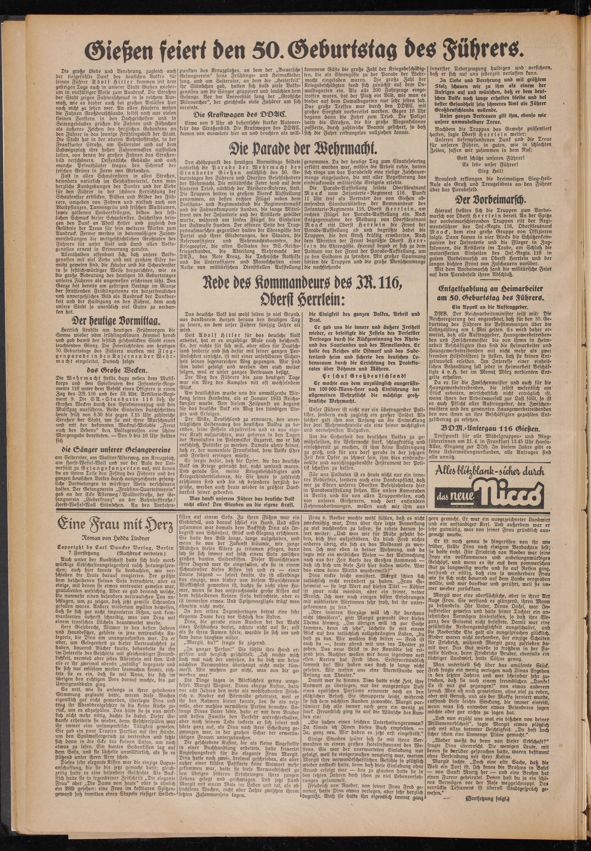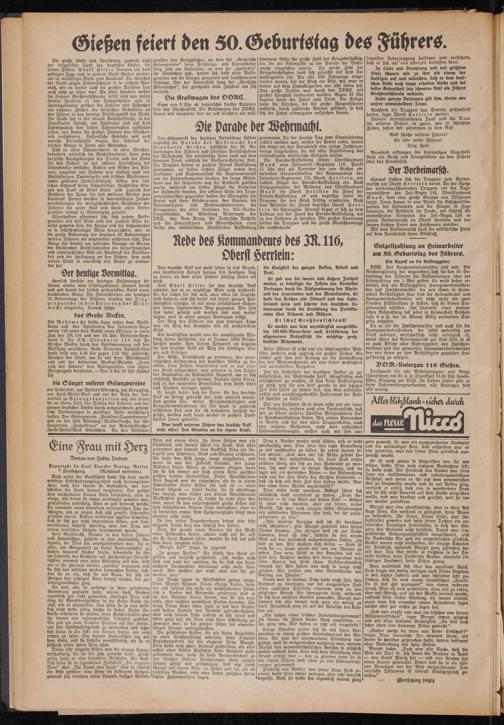 Den Höhepunkt des heutigen Vormittags bildete natürlich die Parade der Wehrmacht des Standorts Gießen anläßlich des 50. Geburtstages des Führers und Obersten Befehlshabers der Wehrmacht. Die militärische Feier fand auf dem Hinteren Trieb, nördlich der Bleidorn-Kaserne, statt. Die Truppen hatten in großem Viereck Aufstellung genommen, an dessen rechten Flügel neben dem Dwisions- und Regimentsstab die Regimentsmusik und die Fahnenkompanie standen, die lange Mittelfront von der Infanterie und der Artillerie gebildet wurde, während am linken Flügel die Einheiten der Luftwaffe standen. Der offenen Seite des Truppenaufmarsches gegenüber hatten die Ehrengäste der Partei und ihrer Gliederungen, des Staates, die Reserveoffiziere und Wehrmachtsbeamten, die Kriegsopfer, die alten Soldaten des NS.-Reichs- kriegerbundes, die Abteilung Wehrmacht der DAF., das Rote Kreuz, die Technische Nothilfe und die Unteroffiziere und Mannschaften einer Reihe von militärischen Dienststellen Aufstellung