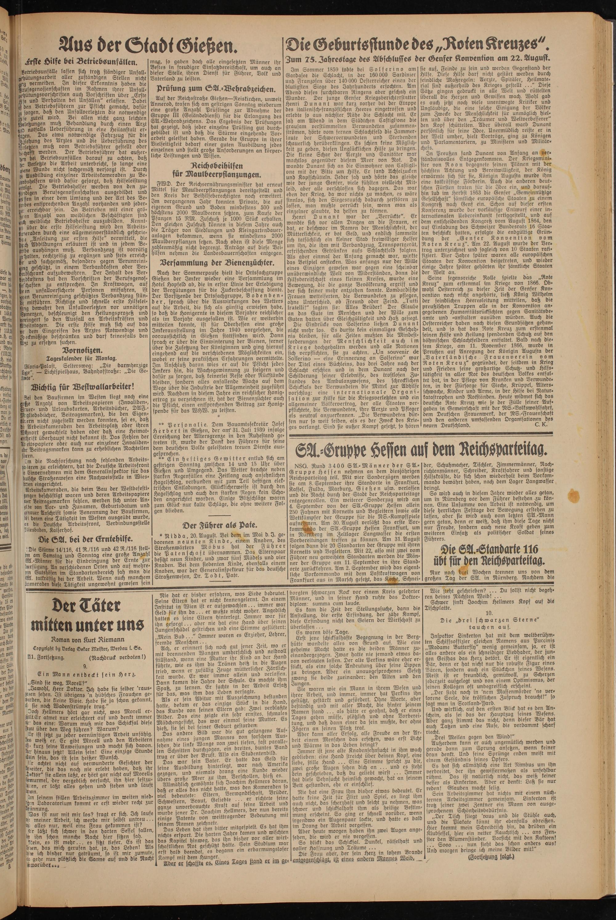 NSG. Rund 3 4 00 SA.-Männer der SA.- Gruppe Hessen nehmen an dem diesjährigen Reichsparteitag teil. Mit vier Sonderzügen werden sie am 8. September ihre Standorte in Frankfurt, Kassel, Fulda, Marburg, Gießen usw. verlassen und die Nacht durch der Stadt der Reichsparteetage entgegenrollen. Ein weiterer Sonderzug wird am 4. September von der SA.-Gruppe Hessen allein 250 Fahnen mit Kornetts und Begleitern sowie alle Wettkämpfer der Gruppe für die NS.-Kampfspiele aufnehmen. Am 30. August verläßt das erste Vor- kommMo der SA.-Gruppe Hessen Frankfurt, um in NuMberg im Zeltlager Langwasser die ersten Vorbereitungen treffen zu können. Am 31. August folgen dann die 20 Standarten der Gruppe mit ihren Kornetts und Begleitern. Mit 22, also mit zwei vom Führer neu geweihten Standarten werden die Männer der Gruppe am 11. September in ihre Standorte zurückkehren. Am 2. September wird das eigentliche Vorkommando mit dem Lastkraftwagen von Frankfurt aus in Marsch gefetzt, das Köche, Schnei