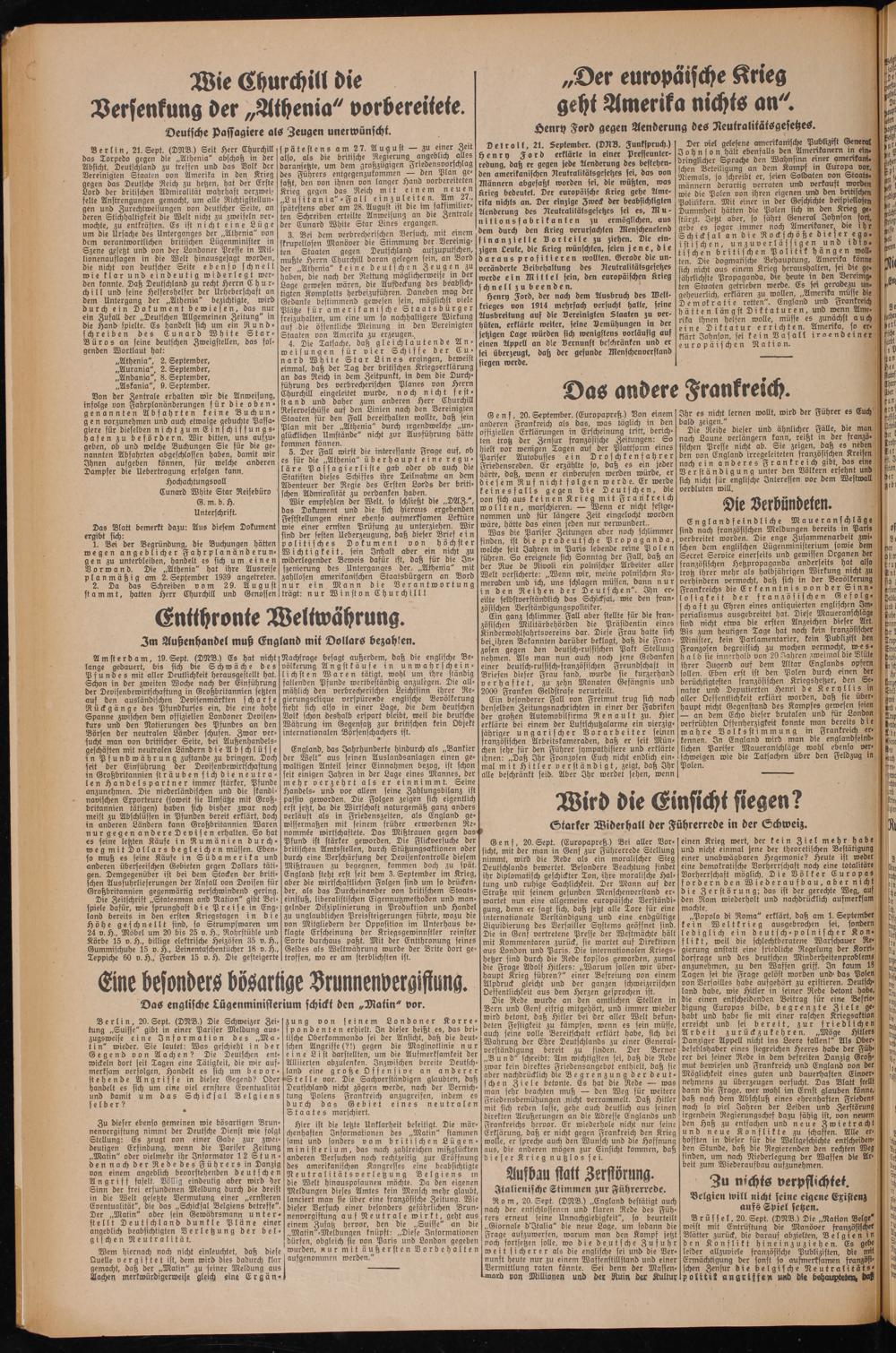 3. Bei bem verbrecherischen Versuch, mit einem skrupellosen Manöver die Stimmung ber Vereinigten Staaten gegen Deutschlanb aufzuputschen, mußte Herrn Churchill baran gelegen fein, an Bord der „Athenia" keine deutschen Zeugen zu haben, die nach der Rettung möglicherweise in der Lage gewesen wären, bie Aufdeckung bes beabsichtigten Komplotts herbeizuführen. Daneben mag ber Gedanke bestimmend gewesen sein, möglichst viele Plätze für amerikanische Staatsbürger freizuhalten, um eine um so nachhaltigere Wirkung auf bie öffentliche Meinung in den Vereinigten Staaten von Amerika zu erzeugen..