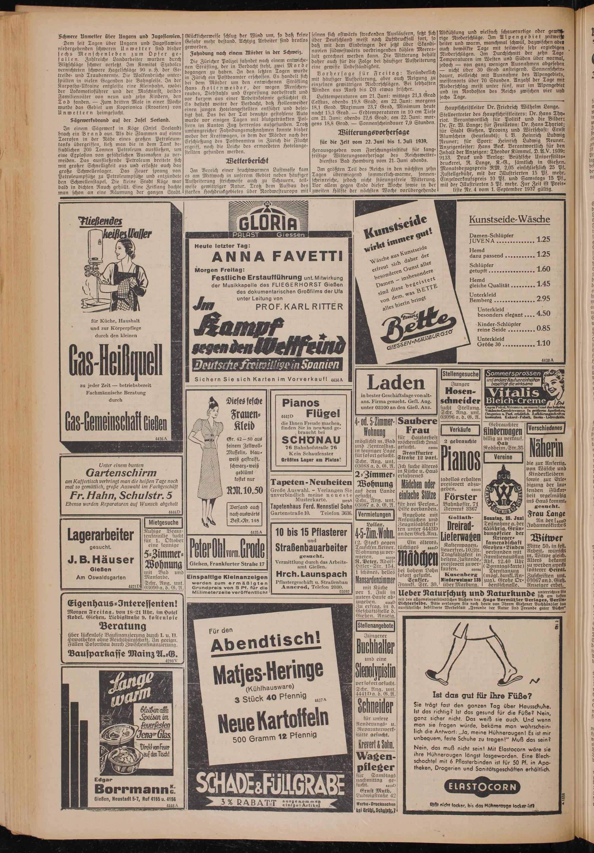 Hauptschriftleiter vr. Friedrich Wilhelm Lange. Stellvertreter des Hauptschriftleiters: Dr. Hans Thy- riot. Verantwortlich für Politik und die Bilder: Dr. Fr. W. Lange; für Feuilleton: Dr. Hans Thyriot; für Stadt Gießen, Provinz und Wirtschaft: Ernst Blumschein (beurlaubt); i. V. Heinrich Ludwig Neuner; für Sport: Heinrich Ludwig Neuner. Anzeigenleiter: Hans Beck. Verantwortlich für den Inhalt der Anzeigen: Theodor Kümmel. D.A.V. 1939: 9133. Druck und Verlag: Brühlsche Universitätsdruckerei, R. Lange, K.-G., sämtlich in Gießen. Monatsbezugspreis RM. 2,05 einschließlich 25 Pf. Zustellgebühr, mit der Illustrierten 15 Pf. mehr. Einzelverkaufspreis 10 Pf. und Samstags 15 Pf., mit der Illustrierten 5 Pf. mehr. Zur Zeit ist Preisliste Nr. 4 vom 1. September 1937 gültig.