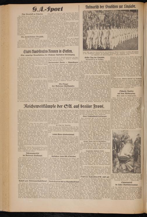 Gute Leistungen gab es bei den Kämpfen der Leichtathleten auf dem Reichssportfeld. Im 200 - Me ter-Lauf hatten Hornberger (Kurpfalz) und Konze (Niederrhein) am Vormittag die famose Zeit von 21,6 Sekunden erzielt. Im Endlauf siegte dann Hornberger in 21,7 vor Konze mit 22,3 und Ruhe (Nordsee) mit 22,4. Im Vorkampf war Truppführer Weinkötz (Niederrhein) im Hochsprung mit 1,92 Meter der weitaus Beste. In der Entscheidung übersprang er dann sogar 1,95 Meter. Der deutsche Meister Gehrnert (Berlin-Brandenburg) kam nicht über 1,85 Meter hinaus. Den 10 000- Meter-Lauf gewann SA.-Mann Max Syring (Mitte) mit über 50 Meter Varsprung vor dem Oberhausener Adam (Niederrhein). Syrings Reit betrug 31:22,6. Im Steinstoßen kamen Heus ex (Niederrhein) und Ulrich (Westfalen) zu Erfolgen.