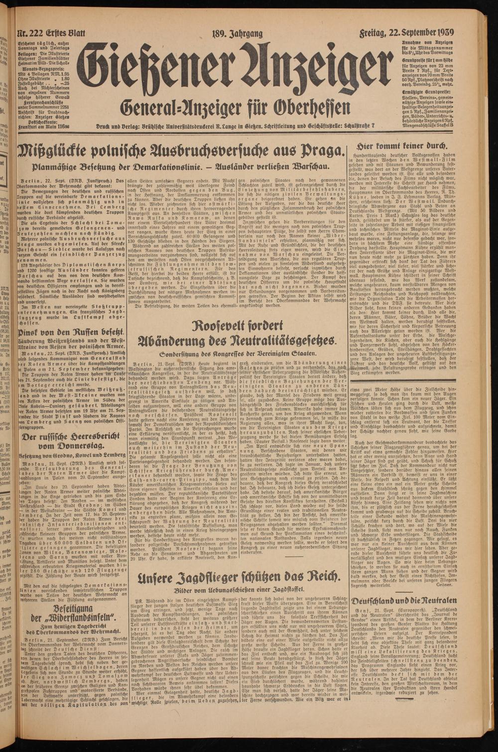 Erscheint täglich, außer Sonntags und Feiertags Beilogen: Die Illustrierte Gießener Familienblatter Heimat im Bild • Die Scholle
