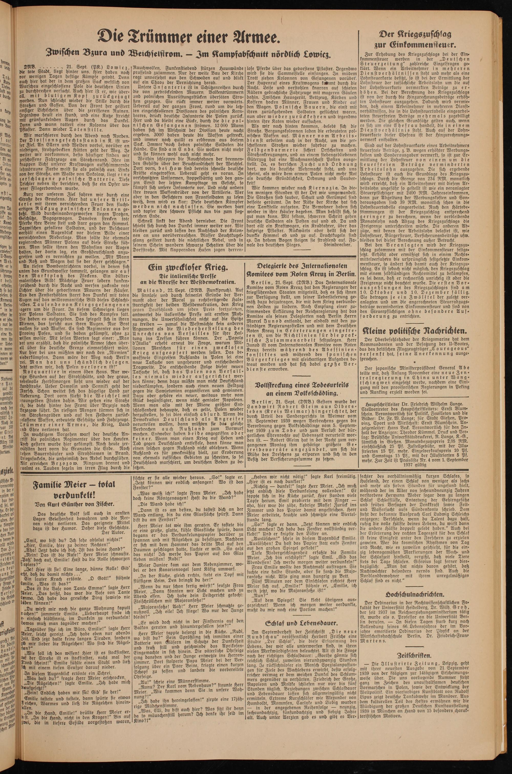 Hauptschriftleiter Dr. Friedrich Wilhelm Lange. Stellvertreter des Hauptschriftleiters: Ernst Blum- schein. Verantwortlich für Politik, Feuilleton und die Bilder: Dr. Fr. W. Lange; für Stadt Gießen, Provinz, Sport und Wirtschaft: Ernst Blumschein. Anzeigenleiter: Hans Beck. Verantwortlich für den Inhalt der Anzeigen: Theodor Kümmel. Druck und Verlag: Brühlsche Universitätsdruckerei, R. Lange, K.-G., sämtlich in Gießen. Monatsbezugspreis 2,05 RM. einschließlich 25 Pf. Zustellgebühr, mit der Illustrierten 15 Pf. mehr. Einzelverkaufspreis 10 Pf. und Samstags 15 Pf., mit der Illustrierten 5 Pf. mehr. Zur Zeit ist Preisliste Nr. 4 vom 1. September 1937 gültig