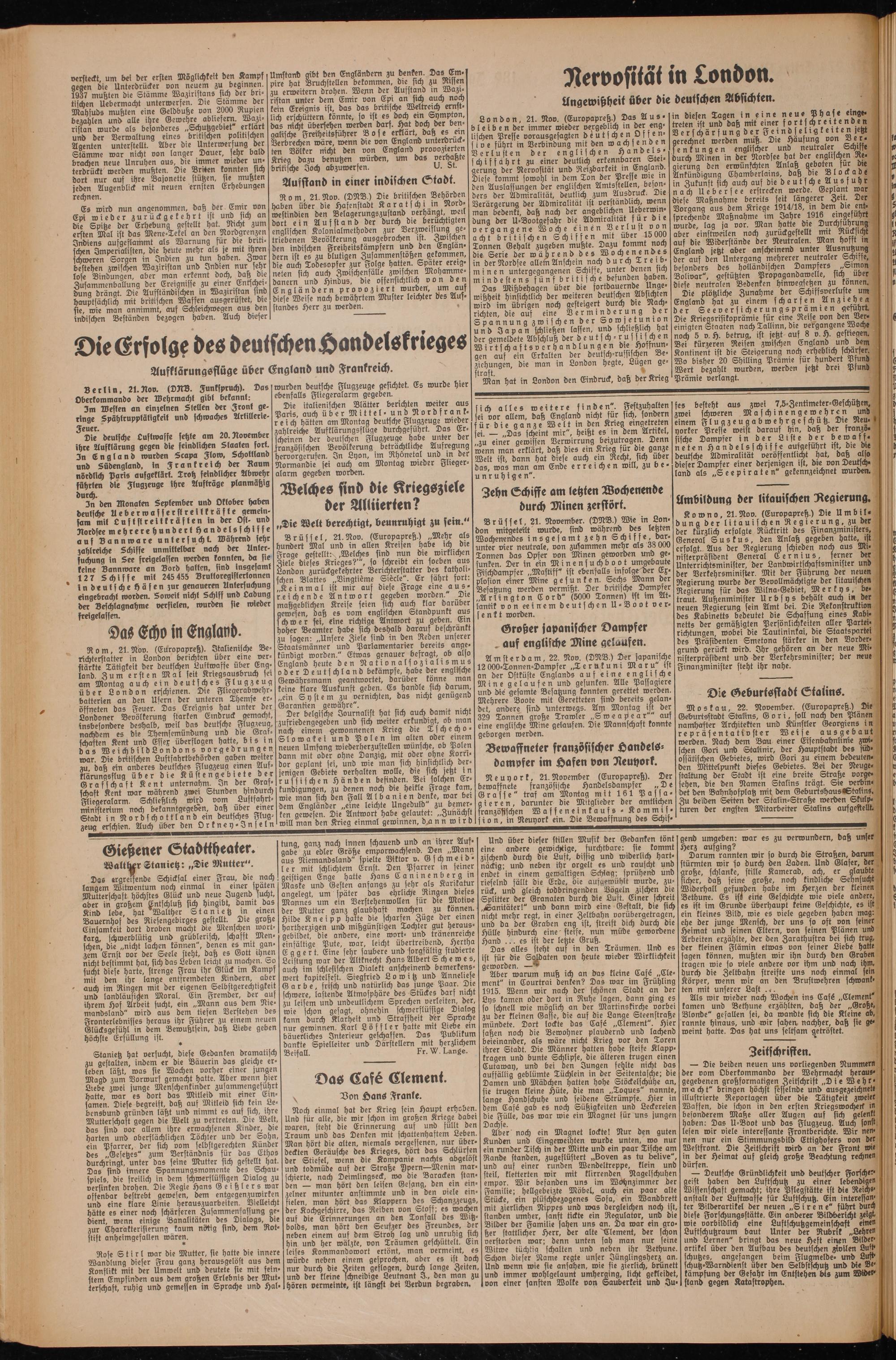 Rom, 21. Nov. (DNB.) Die britischen Behörden haben über die Hafenstadt Karatschi in Nordwestindien den Belagerungszustand verhängt, weil dort ein Aufstand der durch die berüchtigten englischen Kolonialmethoden zur Verzweiflung getriebenen Bevölkerung ausgebrochen ist. Zwischen den indischen Freiheitskämpfern und den Engländern ist es zu blutigen Zusammenstößen gekommen, die auch Todesopfer zur Folge hatten. Später ereigneten sich auch Zwischenfälle zwischen Mohammedanern und Hindus, die offensichtlich von den Engländern provoziert wurden, um auf diese Weise nach bewährtem Muster leichter des Ausstandes Herr zu werden.
