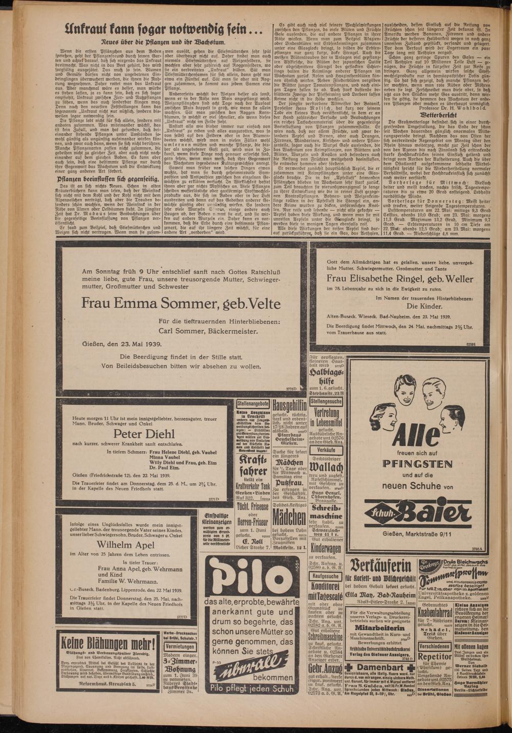 Die Trauerfeier findet Donnerstag, den 25. Mai, nach- mittags 3/2 Uhr, in der Kapelle des Neuen Friedhofs in Gießen statt.