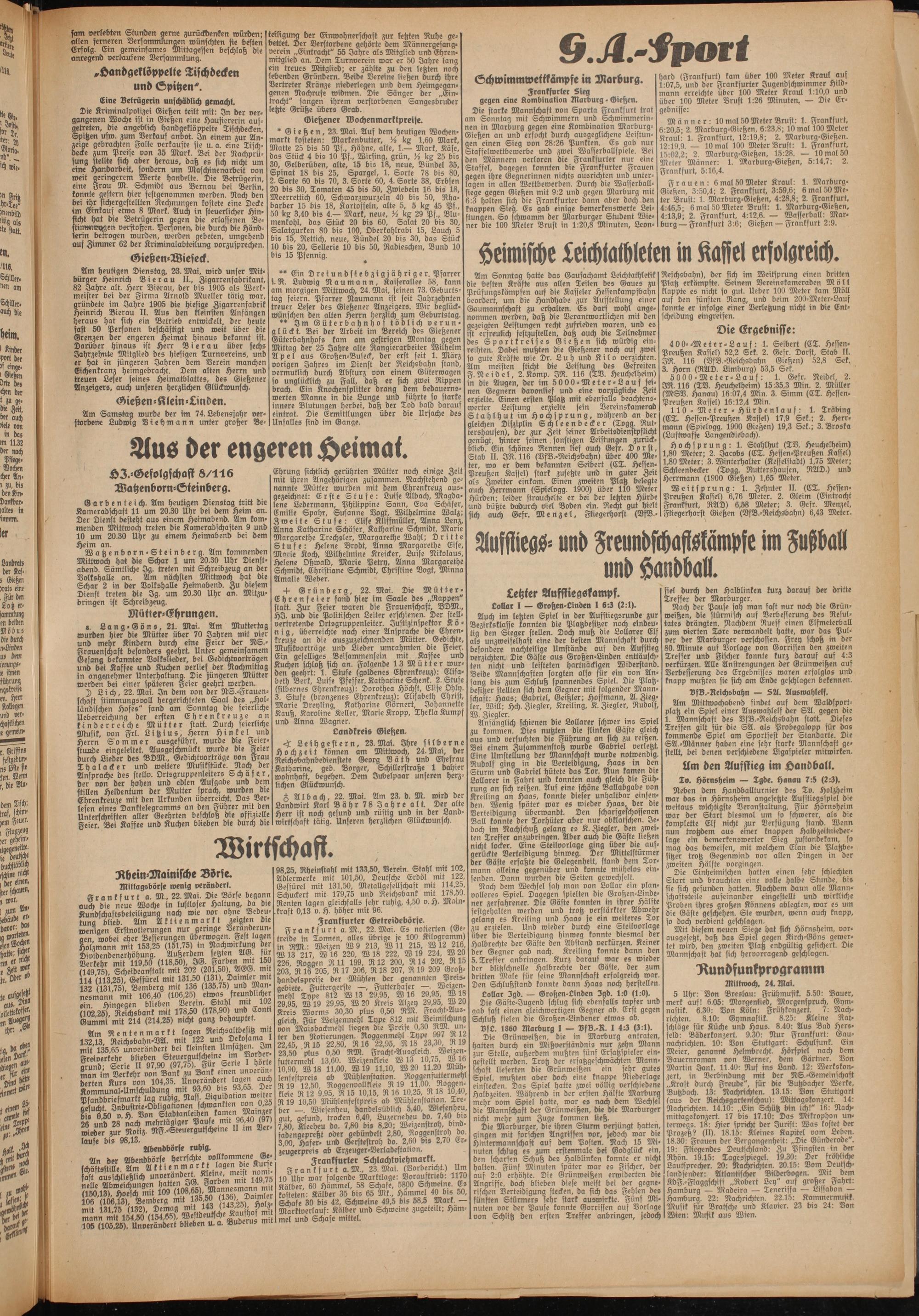 Hochsprung: 1. Stahlhut (TV. Heuchelheim) 1,80 Meter; 2. Jacobs (CT. Hessen-Preußen Kassel) 1,80 Meter; 3. Winterhalter (Kesselstadt) 1,75 Meter; Schleenbecker (Tvgg. Ruttershausen, RAD.) und Herrmann (1900 Gießen) 1,65 Meter.