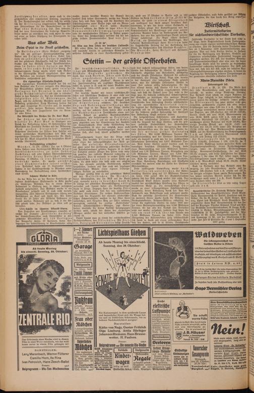 tet, wird am 27. Oktober in Berlin und in 150 Städten im Reich derTobis-Film „D III 88" anlaufen. Er spielt in einem Fliegerhorst und verkörpert den Geist ewigen deutschen Soldatentums, so wie ihn heute unsere Luftwaffe in ihren Reihen pflegt. Ein Kampfflugzeug aus der Richthofenstasfel des Weltkrieges und einer unserer modernen Bomber stehen im Vordergrund des Geschehens, das uns den opferfreudigen Dienst unserer Flieger nahebringt. Die Regie führte Herbert Maisch, ein Frontoffizier des Weltkrieges. Der bekannte Australienflieger Hans Bertram hatte die flugtechnische Leitung bei der Herstellung des Films. In Spitzenrollen sind Christian K a y.ß l e r , Otto Wernicke, Heinz Welzel und Hermann Braun zu sehen.