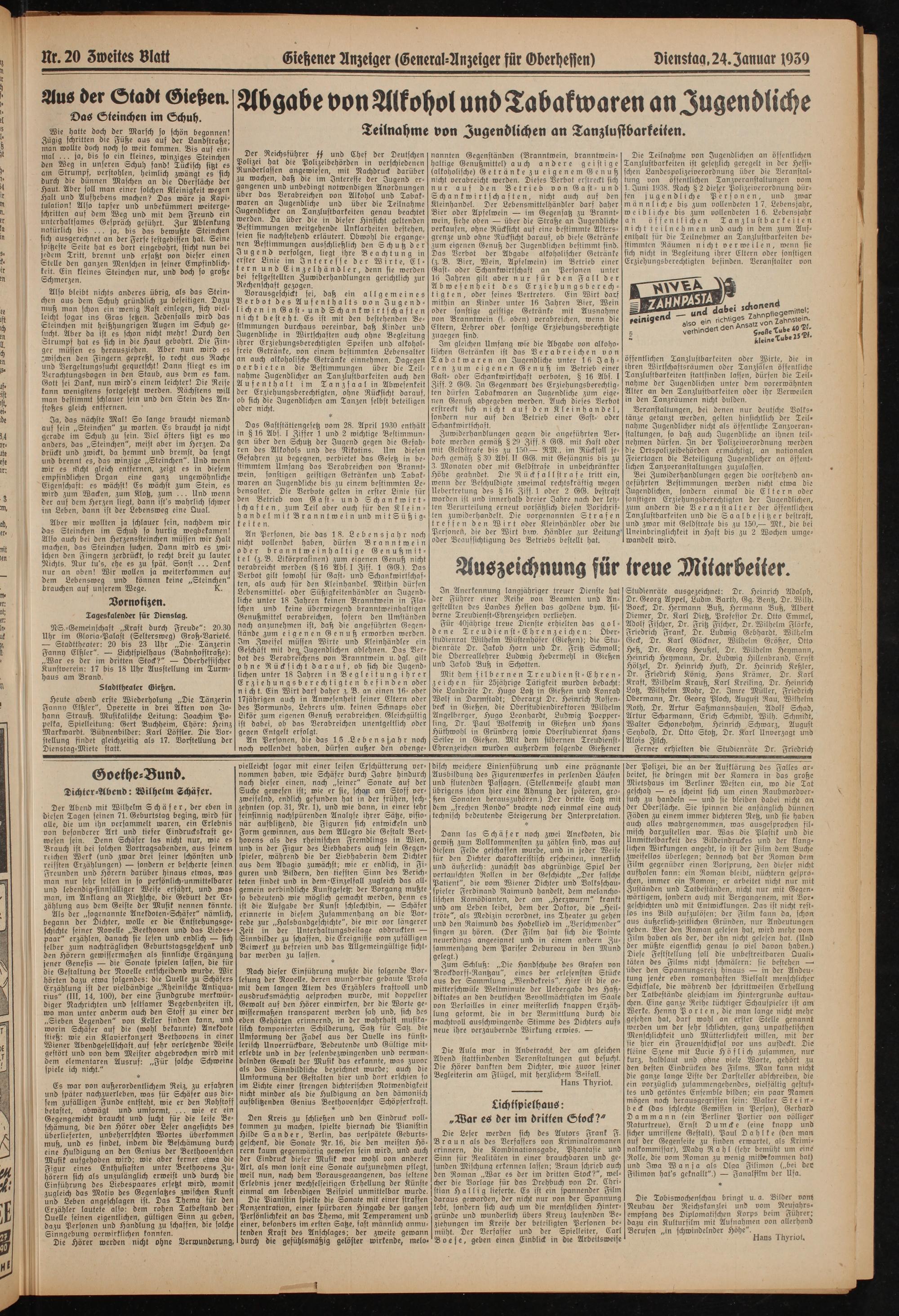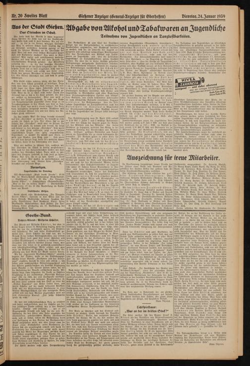 Nr. 20 Zweiter Blatt Gießener Anzeiger (General-Anzeiger für Oberhessen)Dienstag, 24. Zanuar 1939