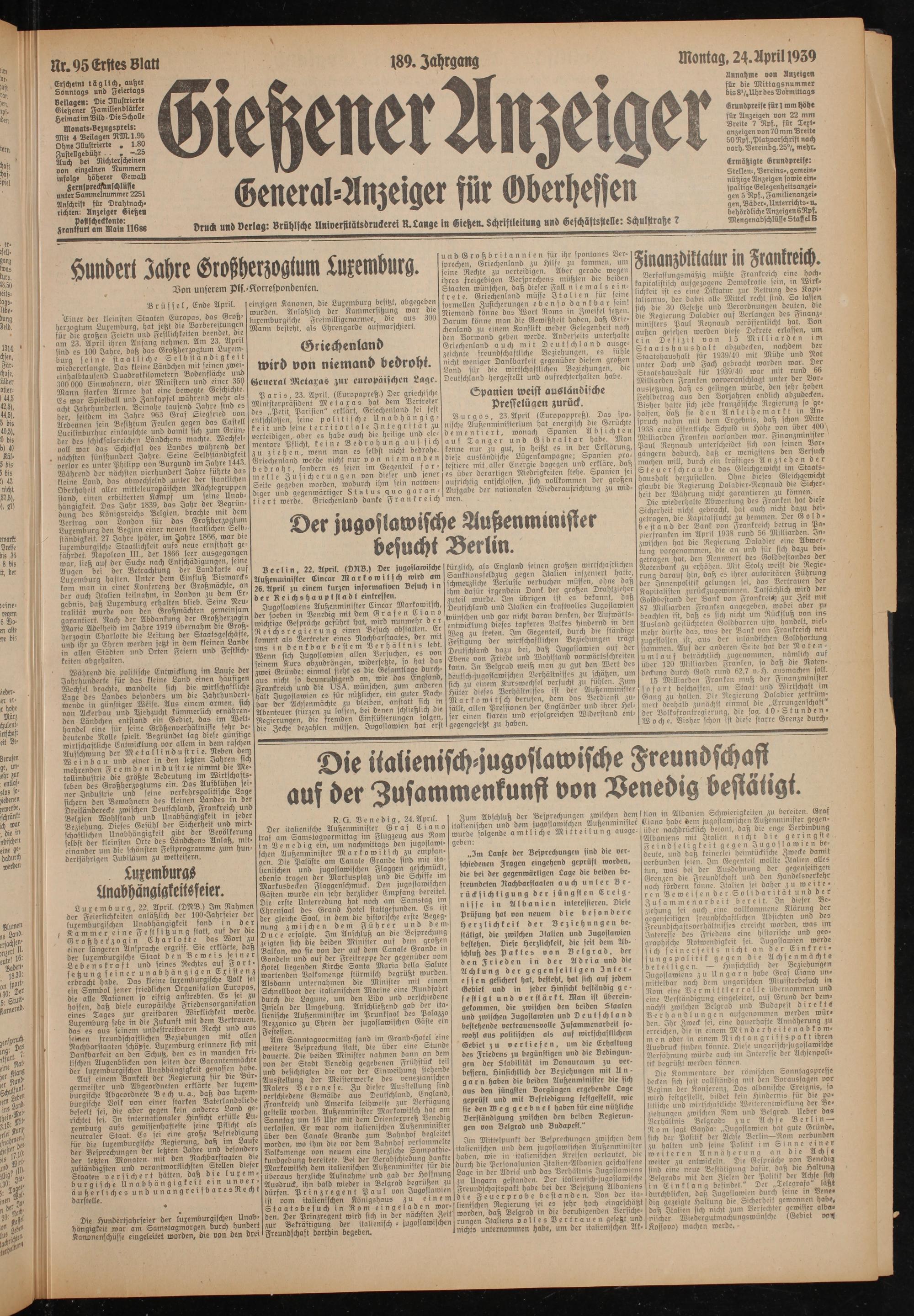 Erscheint täglich, außer Sonntags und Feiertags Beilagen: Die Illustrierte Gießener Familienblätter Heimat im Bild - Die Scholle