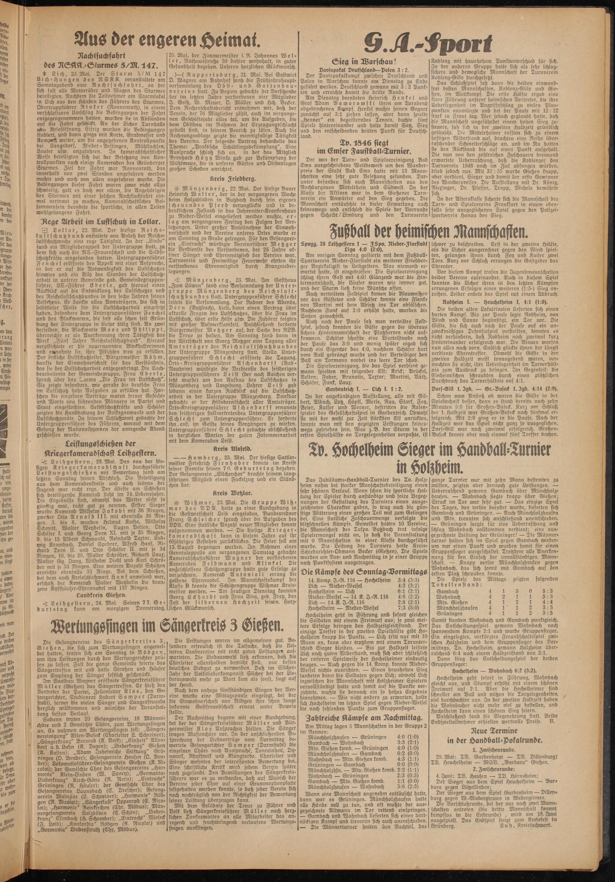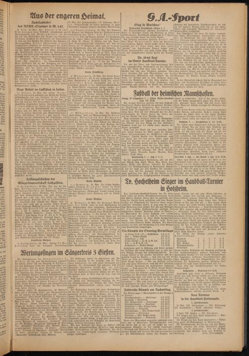 Wenn eine Mannschaft angenehm enttäuscht hatte, dann war es Grüningen. Münchholzhausen hatte alle Hände voll zu tun, und oft mußte der ausgezeichnete Altmann im Tor rettend einspringen. — Gambach und Wohnbach lieferten sich einen hartnäckigen Kampf und trennten sich auch unentschieden. — Die Männerturner hatten den Nachteil, das