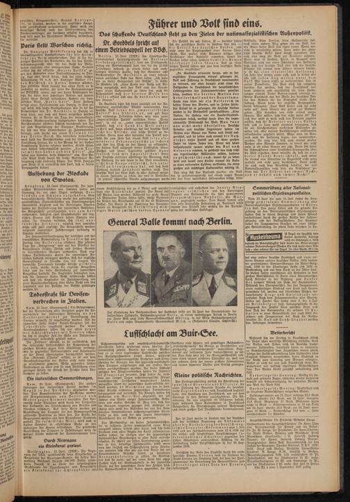 Am Freitagnachmittag verließ die Abordnung der spanischen Generale und Offiziere, die unter Führung des Generals Aranda die heimkehrende LegionCondor nach Deutschland begleitet hatte, von Hamburg aus Deutschland, um auf dem Seewege in ihre Heimat zurückzukehren. Die Abordnung, die aus ungefähr 80 Offizieren besteht, hatte während ihres Aufenthaltes in Deutschland Gelegenheit, die Einrichtungen unserer Wehrmacht und einen großen Teil Deutschlands kennenzulernen.