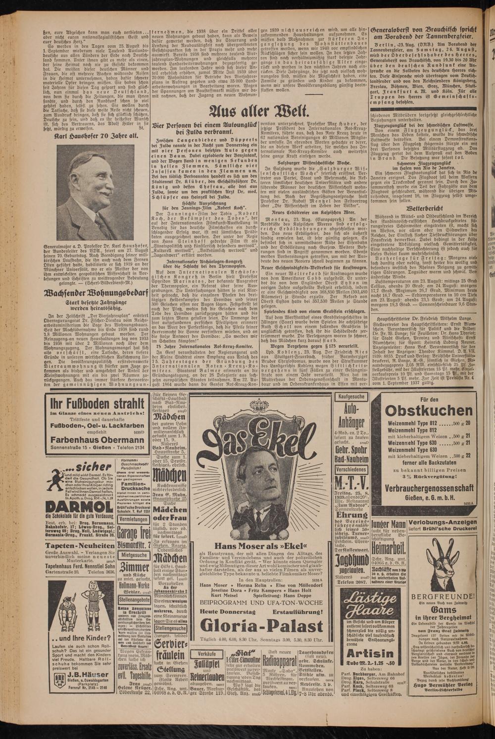Hauptfchriftleiter Dr. Friedrich Wilhelm Lange. Stellvertreter des Hauptschriftleiters: Ernst Blumschein. Verantwortlich für Politik und die Bilder: Dr. Fr. W. Lange; für Feuilleton: Dr. Hans Thyriot; für Stadt Gießen, Provinz und Wirtschaft: Ernst Blumschein; für Sport: Heinrich Ludwig Neuner. Anzeigenleiter: Hans Beck. Verantwortlich für den Inhalt der Anzeigen: Theodor Kümmel. 2). 21. VII. 1939: 8855. Druck und Verlag: Brühlsche Universitätsdruckerei, R. Lange, K.-G., sämtlich in Gießen. Monatsbezugspreis 2,05 RM. einschließlich 25 Pf. Zustellgebühr, mit! der Illustrierten 15 Pf. mehr. (Einseh Verkaufspreis 10 Pf. und Samstags 15 Pf., mit der Illustrierten 5 Pf. mehr. Zur Zeit ist Preisliste Nr. 4 vom 1. September 1937 gültig.