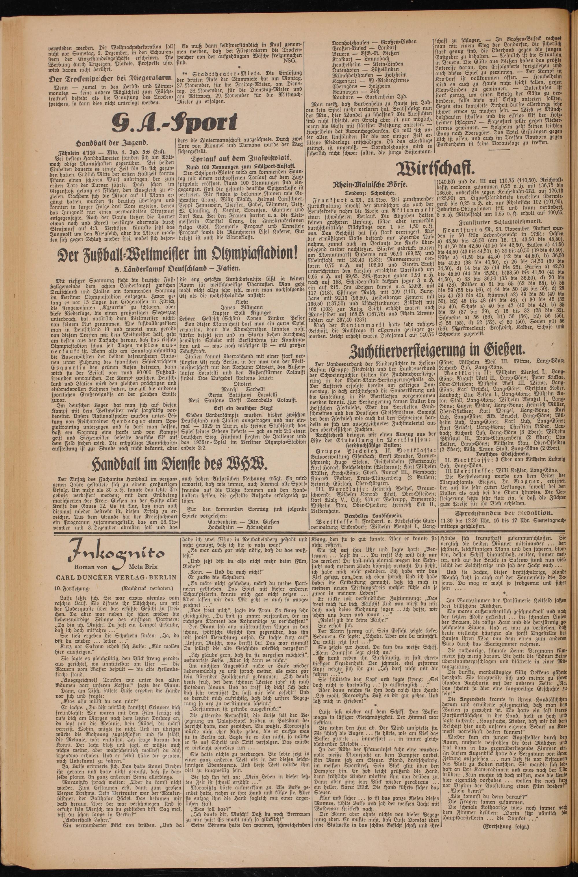 Der Einsatz des Fachamtes Handball im vergangenen Fahre gestaltete sich zu einem großartigen Erfolg. Um mehr als 30 v. H. konnte das letzte Ergebnis verbessert werden; mit dem Endbetrag marschierten der Kreis Gießen an der Spitze aller Kreise des Gaues 12. Es ist klar, daß man auch diesmal wieder bestrebt ist, diesen Erfolg zu erreichen. Aus dem Grunde hat der Kreisfachwart ein Programm zusammengestellt, das am 26. November und 3. Dezember abrollen soll und das